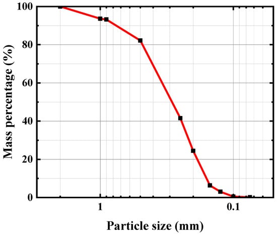 In order to investigate the particle breakage of coral sand after the freezing–seepage coupling process, the particle sieving test was carried out. During particle sieving test, standard sieves with various particle sizes (2 mm, 1 mm, 0.9 mm, 0.5 mm, 0.25 mm, 0.2 mm, 0.15 mm, 0.125 mm, 0.1 mm, 0.075 mm, 0.063 mm, and 0.054 mm) were primarily used. Moreover, a balance was used to measure the mass of the coral sand samples before and after sieving to ensure the accuracy of the test results. In this test, the coral sand samples collected from different zones were placed into a series of standard sieves arranged from large to small particle sizes. A vibrating sieve shaker was used to conduct vibratory sieving of the particles. The step was crucial to ensure that particles of each size were thoroughly separated.