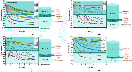 Throughout the one-dimensional soil column unidirectional freezing test, temperature is a crucial reference. After the freezing test, the division of each zone (frozen zone, phase transition zone, and unfrozen zone) was determined based on temperature. By comparing the temperature variation curves under different seepage conditions, the variation in freezing rate could be compared, thereby clarifying differences in freezing behavior under different seepage conditions. The variations in freezing temperature of coral sand under different seepage conditions are shown in Figure 7.