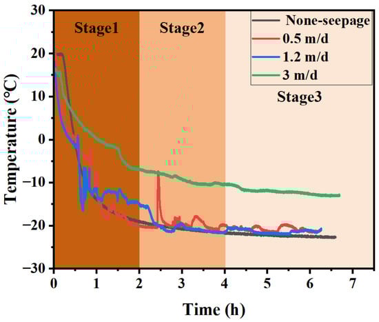 To conduct a more in-depth analysis of the influence of different seepage conditions on the freezing temperature of coral sand, the temperature variations at a height of 1 cm over time under different seepage conditions are shown in Figure 8. In this figure, according to the downward trend of the temperature–time variation curves, the entire process of temperature variation is divided into three stages. Stage 1 to Stage 3 represent the initial freezing stage, the mid-freezing stage, and the final freezing stage. Taking the none-seepage condition as an example, in the initial freezing stage (Stage 1) the temperature of coral sand drops rapidly. This is because the circulating fluid has been cooled to the preset temperature (−30 °C) before the test begins. A significant temperature gradient exists between coral sand and cold source, resulting in an intense heat transfer. Consequently, the temperature drops at a rapid pace. As the freezing process continues, the temperature gradient between coral sand and cold source gradually decreases, and the heat exchange effect weakens. Therefore, the temperature of coral sand drops slowly (Stage 2). In the final freezing stage (Stage 3), the heat exchange between coral sand and cold source basically reaches equilibrium, and the temperature eventually stabilizes [24]. It should be noted that due to inevitable heat dissipation losses, the temperature of coral sand cannot reach the designated freezing temperature.
