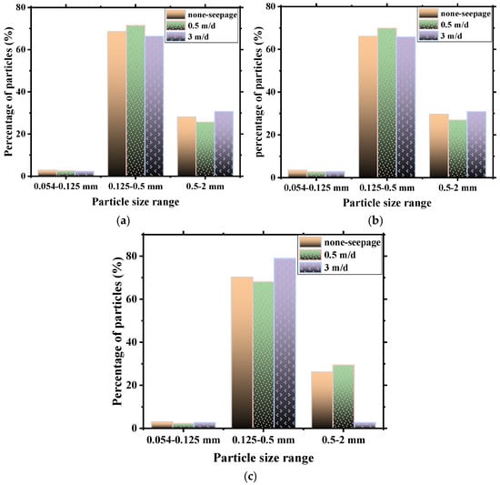 To investigate the particle breakage characteristics of coral sand under the action of freezing and seepage coupling, the particle sieving test was conducted after the freezing test using coral sand samples from three different zones. Three seepage conditions (none-seepage, 0.5 m/d, and 3 m/d) were selected for comparison. The mass percentage of particles within three different particle size ranges (0.054–0.125 mm, 0.125–0.5 mm, and 0.5–2 mm) in different zones under various seepage conditions are shown in Figure 9.