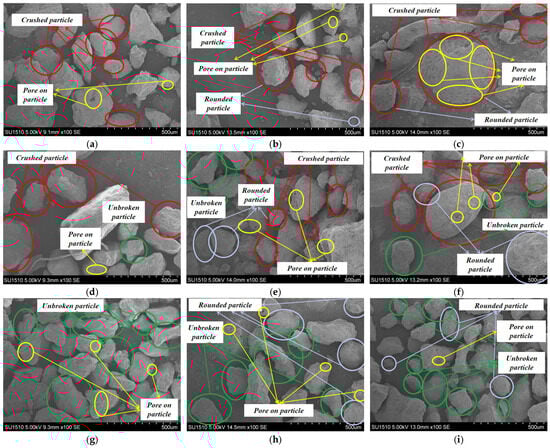 Images of coral sand particles in different zones magnified 100× under different freezing–seepage coupling effects. (a) Frozen zone (none-seepage). (b) Frozen zone (0.5 m/d). (c) Frozen zone (3 m/d). (d) Phase transition zone (none-seepage). (e) Phase transition zone (0.5 m/d). (f) Phase transition zone (3 m/d). (g) Unfrozen zone (none-seepage). (h) Unfrozen zone (0.5 m/d). (i) Unfrozen zone (3 m/d).