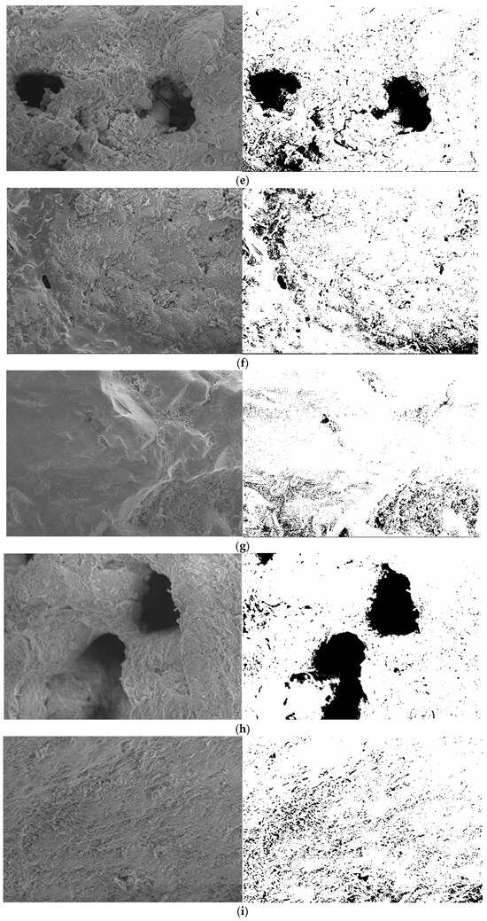 In order to further analyze the variations in the microstructure of coral sand particles under the freezing–seepage coupling process, images of particles in each zone under different seepage conditions were magnified 1000 times and the images were binarized using the threshold segmentation method, as shown in Figure 12. Subsequently, the surface porosity of each particle was calculated using the binarized images, as shown in Figure 13. It could be found that under the same seepage conditions, the surface porosity of particles in the frozen zone is generally higher than that in the phase transition zone and unfrozen zone. It is likely because the frost heave generated during the freezing process caused the original cracks inside the particles to expand and connect, exposing the internal pores to the surface. Consequently, a higher surface porosity is shown in the images. In addition, when the seepage velocity increases from 0 to 0.5 m/d, the surface porosity in all zones shows an upward trend. This may be attributed to the fact that seepage further promotes the growth of ice lenses, thereby magnifying the frost heave damage effect. However, when the seepage velocity increases to 3 m/d, the intense seepage exerts a significant scouring effect on the particle. Meanwhile, the strong convective heat transfer effect brought by higher seepage velocity inhibits the freezing effect, leading to a decrease in the surface porosity of particles in each zone.