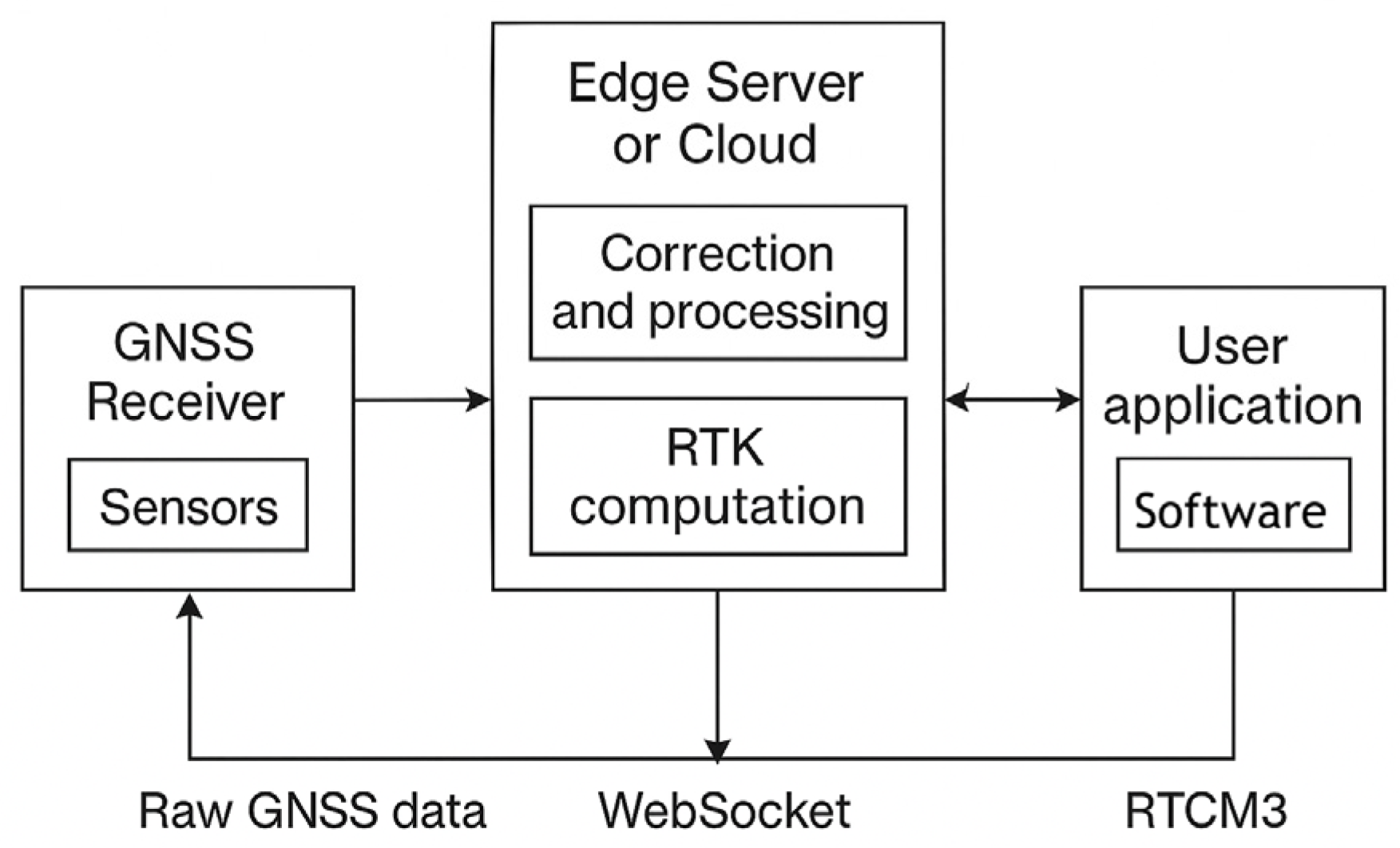 | Edge architecture [171] | Transfer of computations to edge servers; the cloud performs the final calculation | Edge servers + cloud | Less latency than in a centralized cloud | Centimeter accuracy (PPP/RTK) is maintained | Tractor movement under shading conditions |