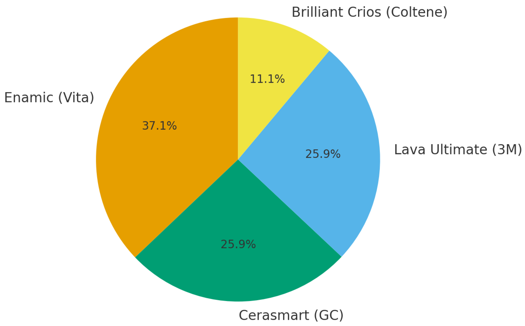 | 37. Alsarani, 2024 [82] | Cerasmart (GC) Lava Ultimate (3M/ESPE) Shofu Block HC (SHOFU) Enamic (VITA) IPS Emax CAD (IVOCLAR) | NR | NR | NR | NR | 8 | SENB | 1.17 (0.15) 1.24 (0.23 1.20 (0.24) 1.39 (0.29) 1,78 (0,21) |