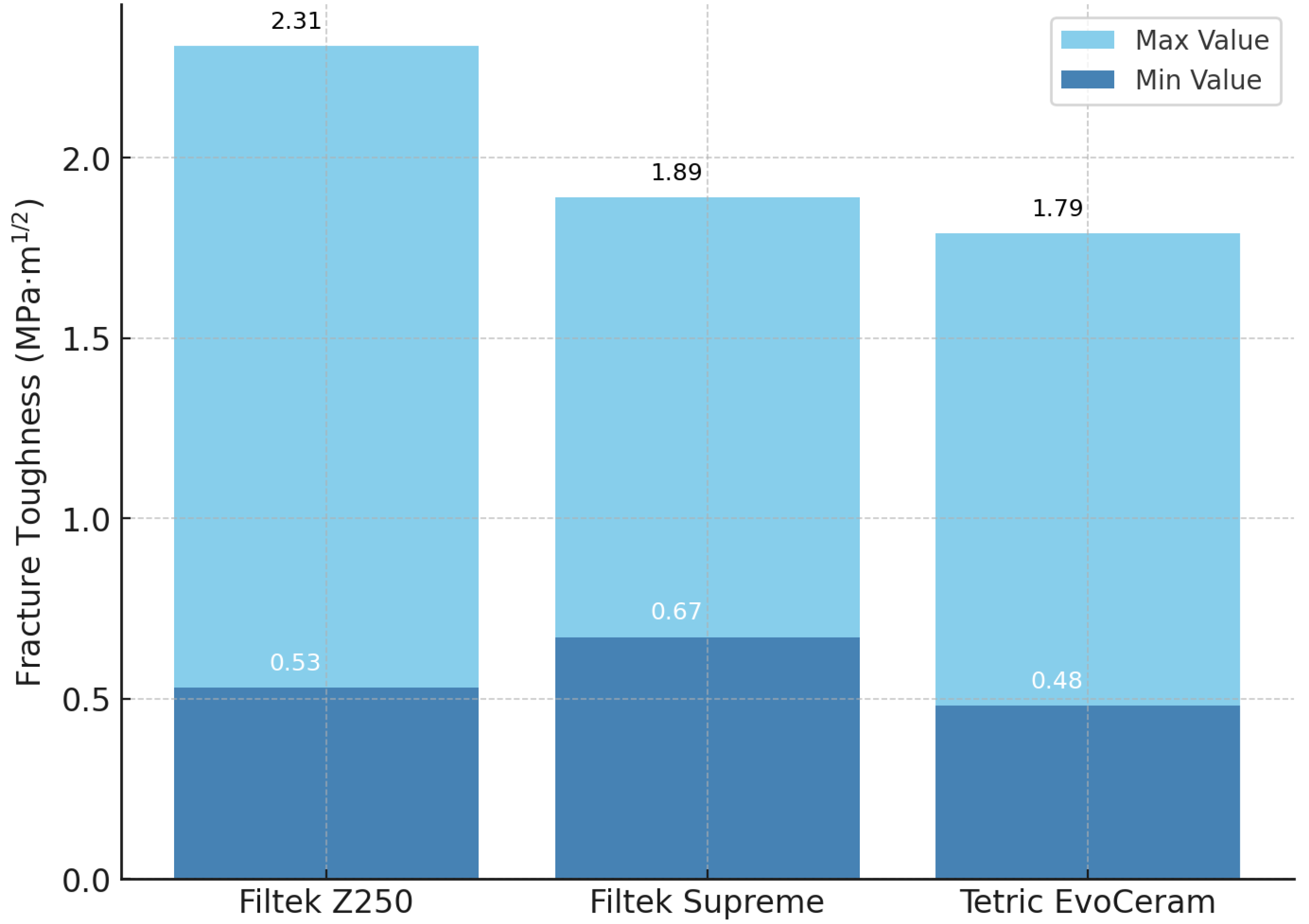 | 14. Ilie, 2012 [57] | Venus (KULZER) Tetric Ceram (IVOCLAR) Z100 (3M/ESPE) Clearfil ST (KURARAY) Charisma (KULZER) Point 4 (KERR) Herculite XRV (KERR) TPH Spectrum (DENTSPLY) Synergy Duo Shade (COLTENE) Esthet X (DENTSPLY) Z250 (3M/ESPE) Enamel plus (GDF) Miris (COLTENE) Filtek Supreme (3M/ESPE) | oven Dentacolor XS (KULZER) | Polywave | NR | 40 | 8 | SENB ASTM E399 [49] | 1.18 (0.21) 1.70 (0.18) 1.81 (0.22) 1.81 (0.44) 1.87 (0.20) 1.89 (0.40) 1.96 (0.25) 2.09 (0.22) 2.12 (0.21) 2.15 (0.25) 2.31 (0.16) 2.40 (0.56) 2.17 (0.33) 1.46 (0.28) |