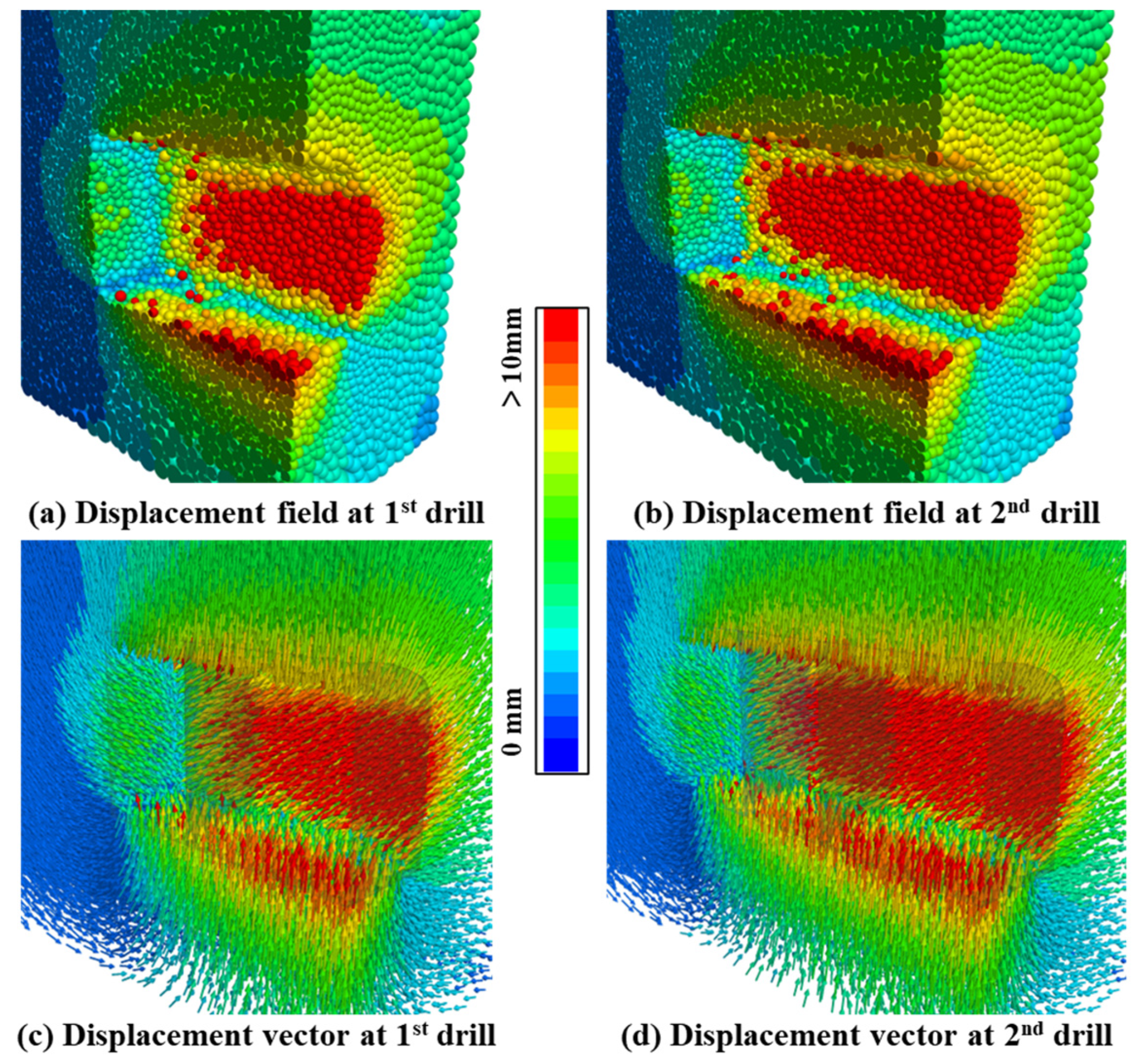 - Due to the maximum external load applied in the horizontal direction, the deformation of the side walls of the tunnel (greater than 10 mm) is significantly greater than that of the surrounding rock of the roof and floor (4–8.5 mm). At the end of the mechanical excavation process, there are still some large deformation particles (with more than 4 cm of movement) remaining on the surface of the tunnel, so these “floating stones” need to be handled carefully in the project. In addition, although the support structure can suppress the deformation of the surrounding rock in the area, the new excavation area needs to complete the support operation in a timely manner (unsupported rock shows a faster deformation rate) to prevent the extreme deformation of the surrounding rock.