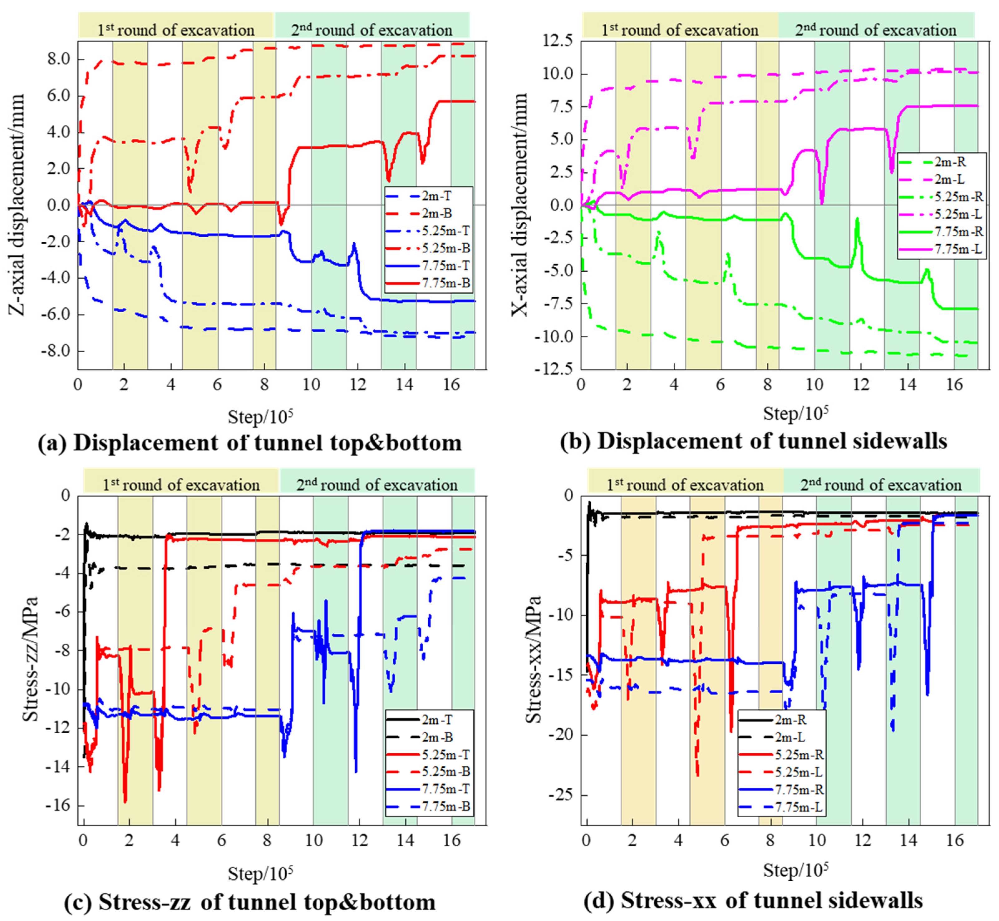 - In the initial state (subgraph a), the principal stress at the top center bottom measuring point is relatively small (0–4 m) in the constructed tunnel, while the triaxial principal stress values in the unexcavated rock mass remain stable. From the stress-monitoring curves on the left and right sides, it can be observed that there is not much difference between the two in terms of maximum and minimum principal stresses. However, the principal stress in the middle of the right side is significantly lower than that on the left side (averaging 10% lower). This may be due to uneven convergence on both sides of the tunnel, and the deeper reason is the uneven deformation caused by the inclined rock layers.
