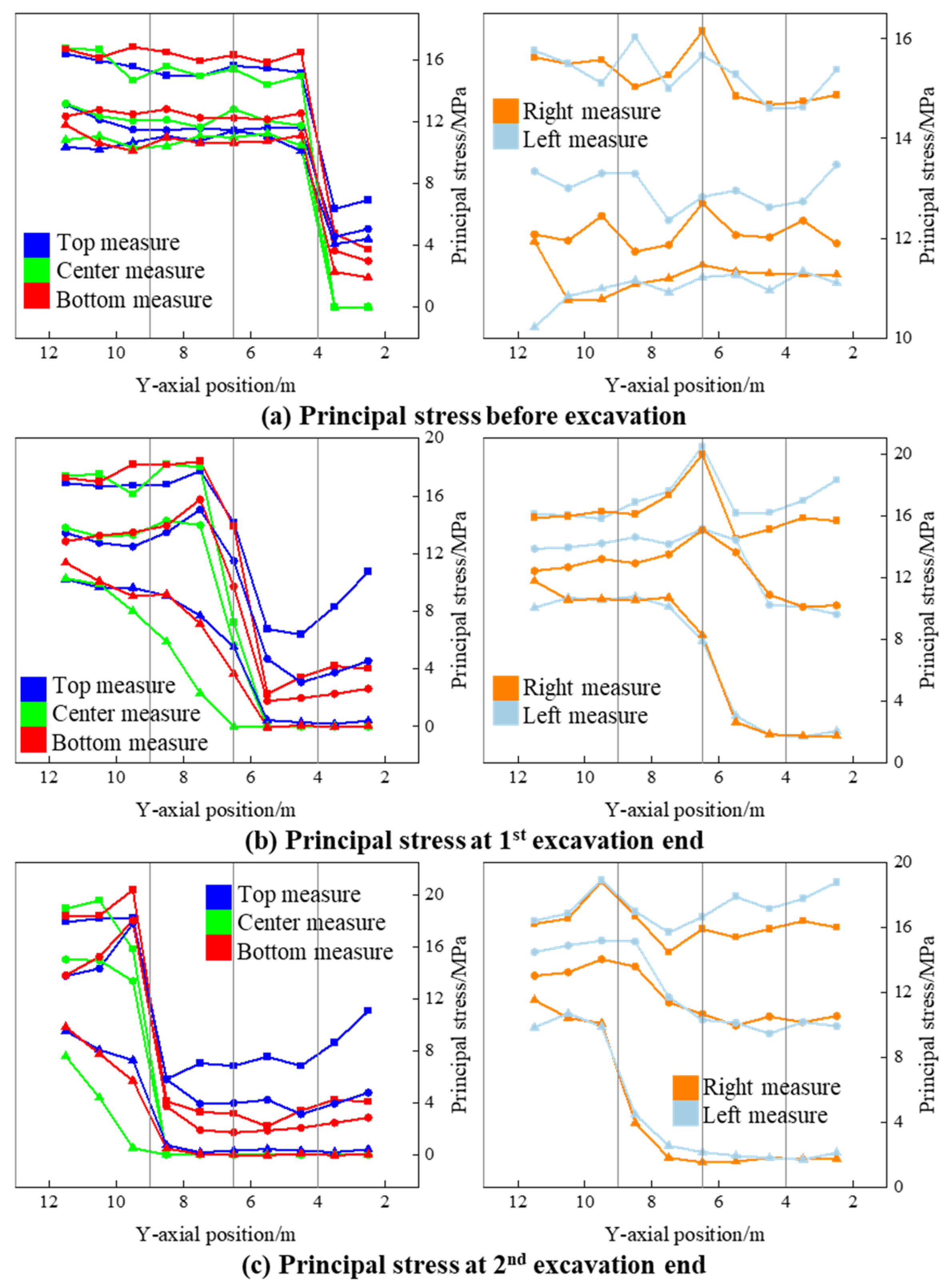 - After the first excavation is completed (subfigure b), the principal stress of the top center bottom measuring points at the four positions on the right (y = 2.5 m − 5.5 m) remains basically stable; however, the maximum principal stress at the top measuring point showed a significant increase in the early stage of the tunnel, while the minimum principal stress at the top and bottom measuring points dropped from around 2 MPa to 0. The stress of the surrounding rock on the excavation face quickly recovered, and the top and bottom measuring points returned to the far-field stress state at y = 7.5 m, while the center measuring point only fully recovered the stress at y = 12 m. According to the monitoring results of the horizontal measuring points, the minimum principal stress is maintained at around 1 MPa in the excavated tunnel, the middle principal stress slightly decreases, and the maximum principal stress increases significantly compared to the initial state. The maximum principal stress in the horizontal measuring point reaches its peak near the excavation surface, indicating a significant stress concentration at that location; The surrounding rock 1 m deep in front of the excavation has been restored to the far-field stress state.