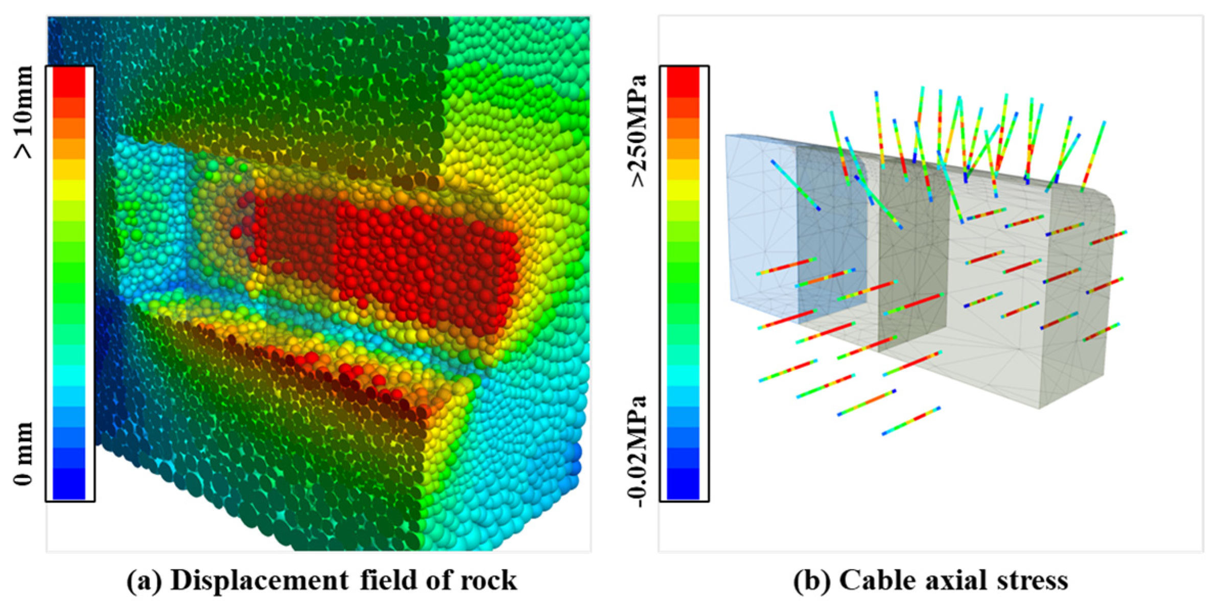 - The application of the PFC3D-FLAC3D coupled model can significantly reduce the number of particles and improve computational efficiency. The PFC3D model in this article accounts for 5.2% of the total model volume and contains over 290,000 particles. It is reasonable to speculate that using the large-scale PFC3D model would require at least 2 million particles.