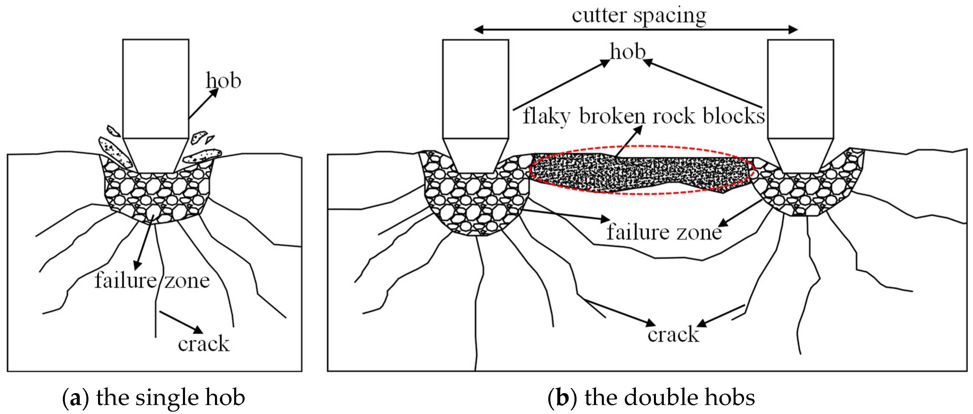 Mechanical rock-breaking, which has witnessed significant advancements in technology, is now widely used in mining, tunnelling, railway, construction, and other relevant fields. Hob rock-breaking, in particular, finds extensive usage in such fields. Hob rock-breaking is a complicated process that depends on different factors, including the strength of the rock body, the hob’s structural and working parameters, among others. These factors affect the outcome of the rock-breaking in diverse ways. It is thus imperative to study the mechanism of hob rock-breaking thoroughly to break deep rock and hard rock layers with greater efficiency. The conventional hob rock breaking model is shown in Figure 1.