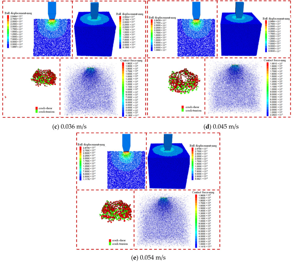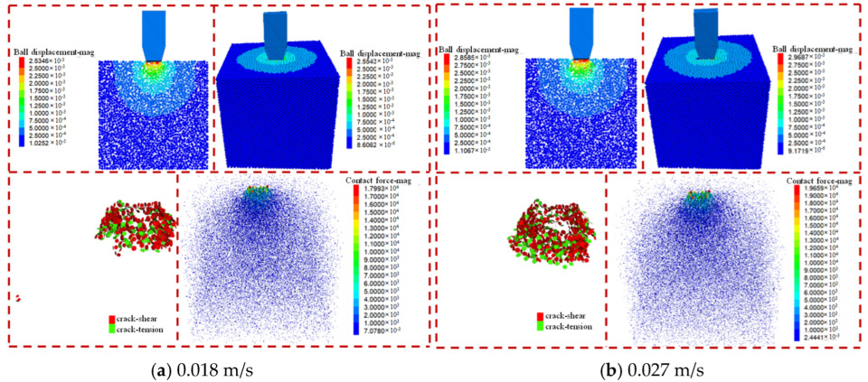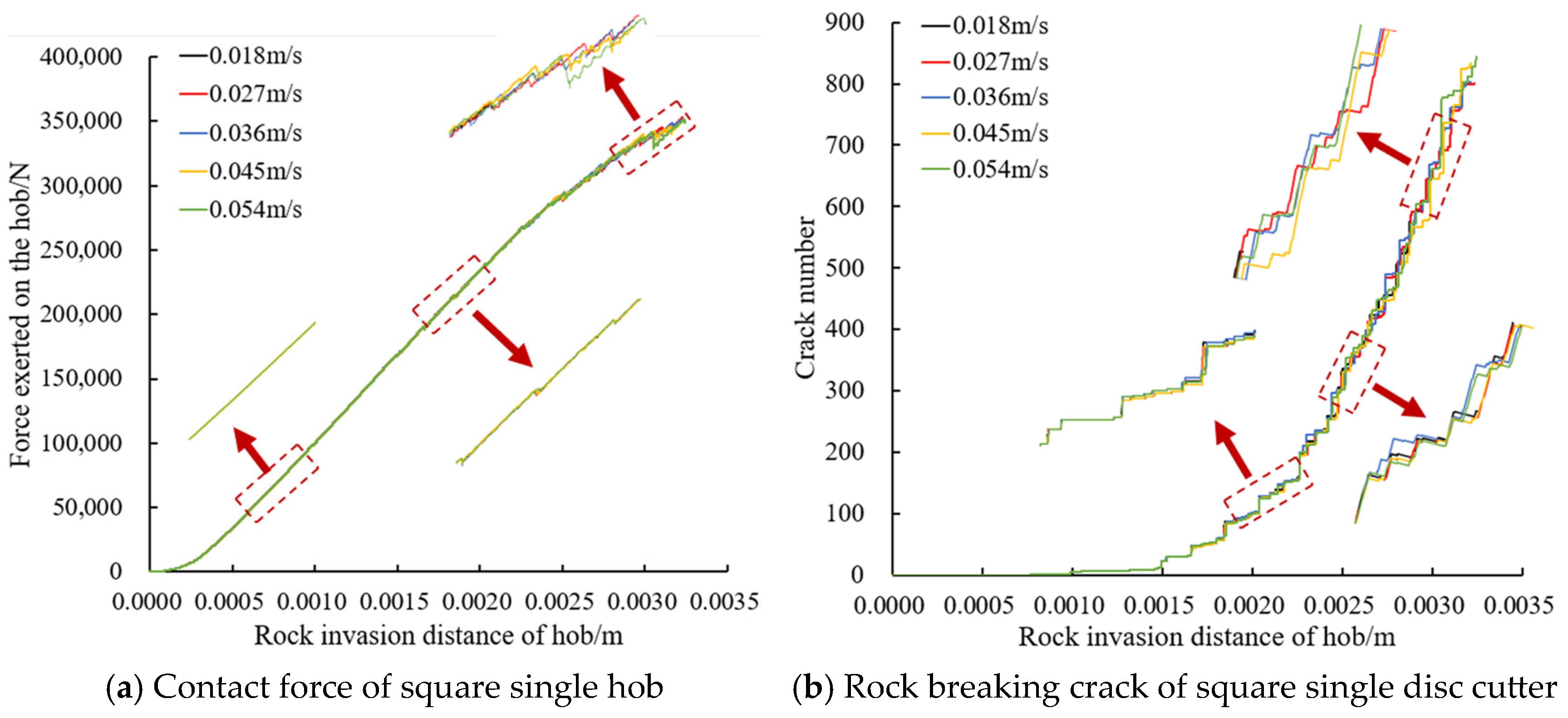 (1) The contact force of the hob and the number of cracks under different rock intrusion velocities of the single hob demonstrate an increasing trend. The rock-breaking patterns extend from the rock surface to the interior, encompassing a greater range of potential damage zones. The damage cracks are predominantly shear cracks.