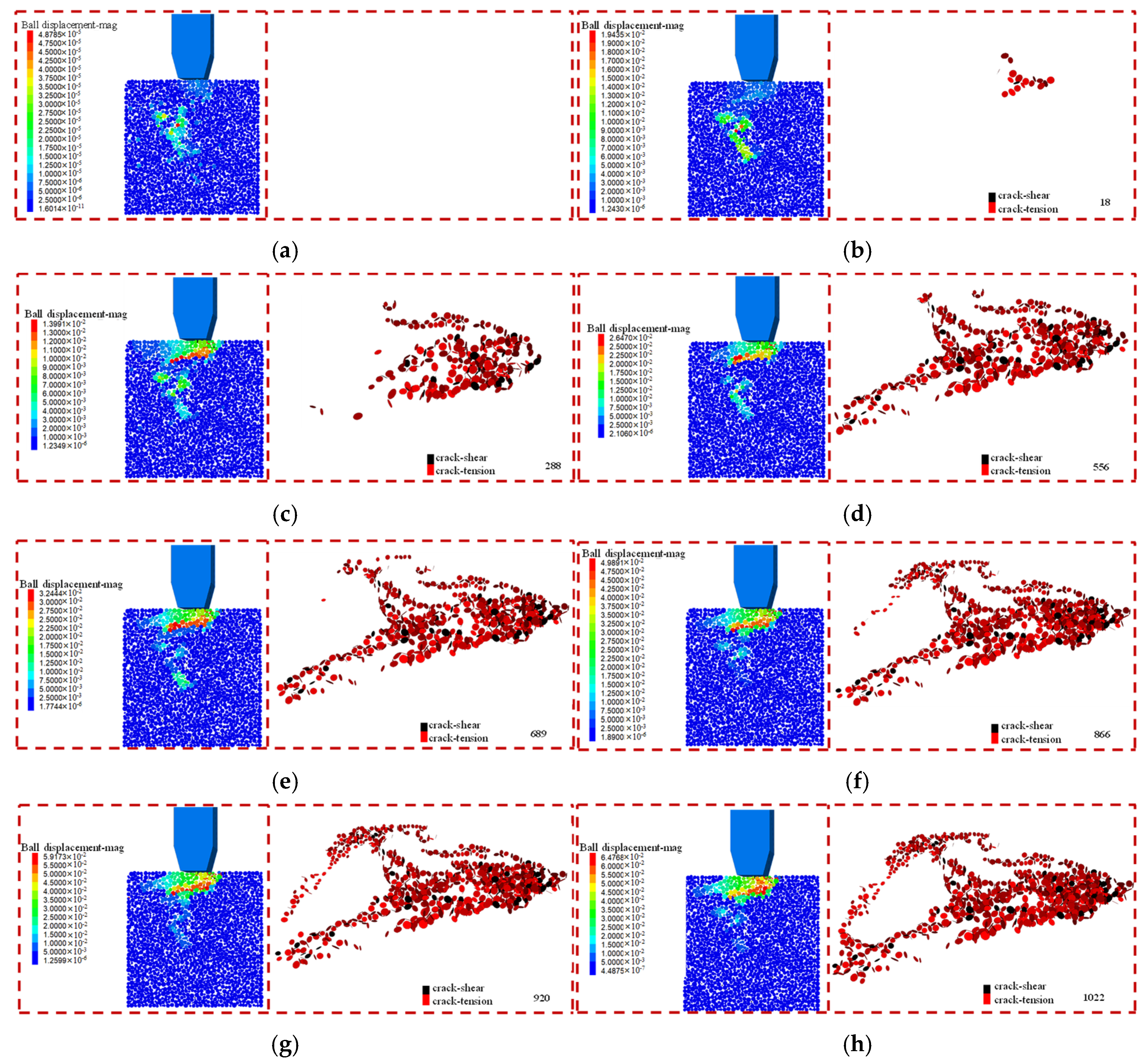 When combined with Figure 12, it becomes apparent that RDFN rock damage and crack extension can be divided into three primary stages. Moving from Figure 12a,b, the cracks initially occur at the intersection of the structural surfaces closest to the hob, similar to the DFN model. The cracks then rapidly penetrate the rock surface, forming a large range of damage zones in the shallow part during the stage between Figure 12b,e. To extend the damage further, cracks begin to expand noticeably along the edges of the structural surfaces and along the initially developed part of the cracks. In the final stage, from Figure 12e–h, the cracks mainly extend to the inside of the damaged structural surfaces and along the initially developed part of the cracks to the rock surface. The tensile cracks dominate during the entire rock-breaking period.