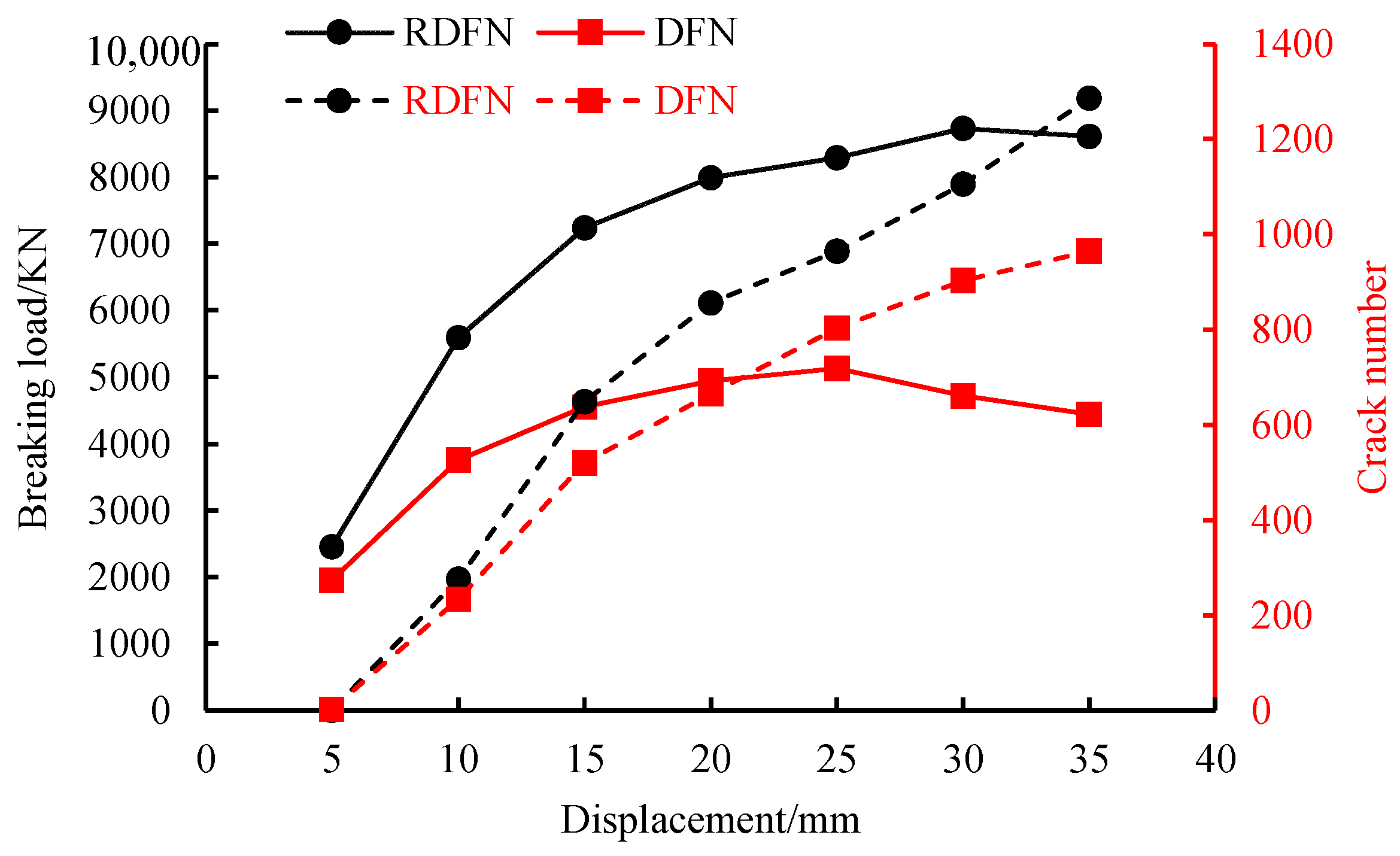 Figure 10 and Figure 11 show that the stress distribution density in the rock body of the RDFN model is equal to that in the DFN model. A significant difference in hob contact force and the change in the number of cracks can be observed. During the rock-breaking period, the hob contact force of the RDFN model exceeds that of the DFN model, resulting in more significant hob wear. The RDFN model records the ultimate hob contact force in the late rock-breaking period, while the DFN model records that moment during the middle of the rock-breaking period. Additionally, the overall magnitude of change is lower than that of the RDFN model. The reason for this outcome is the rougher surface of the structural face in the RDFN model and the hob’s smaller inclination angle in the vertical direction. As a result, the hob causes less rock encroachment. The reason why the hob initially destroys the micro-convex parts, compacts them, and subsequently destroys the structural face as a whole is due to the rough surface of the structural face in the RDFN model and the hob’s small inclination angle in the vertical direction. In the RDFN model, crack development takes place at the intersection of two groups of structural surfaces. One of the groups has a higher dip angle. In the RDFN model, the microconvex part between structural surfaces forms a mesh that hinders the rock breaking process more than in the DFN model. Consequently, during the early stages of crack development, the RDFN model exhibits a lower number of cracks than the DFN model, and they manifest later. At the point of crossing between the rock-breaking crack number curves, the RDFN model indicates a greater number of destructive cracks compared to the DFN model.