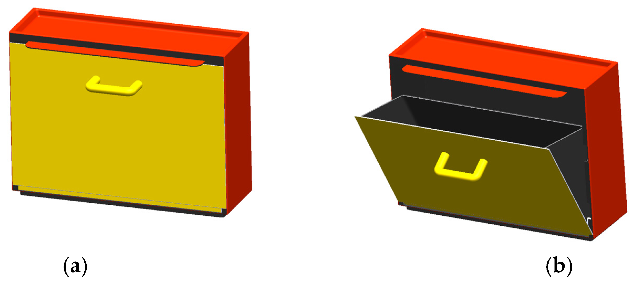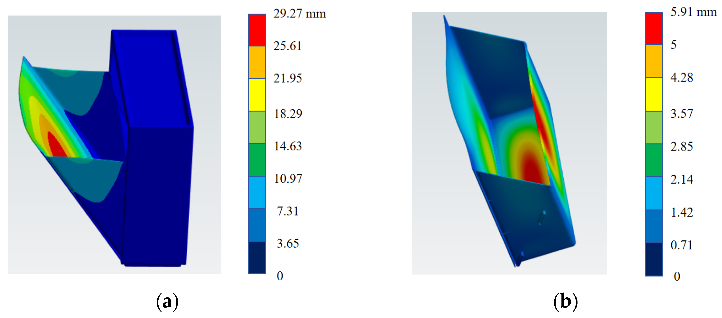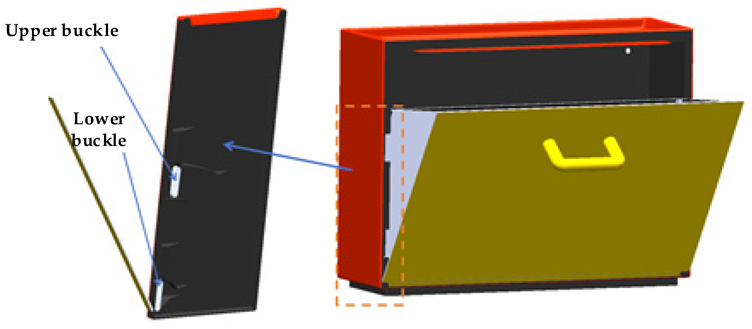 - The experimental results of the load-bearing limit of the shoe box show that the failure load in the open state is 13.2–15.4 kg, which is manifested as the fracture of the lower buckle and the slipping of the inner liner. In the finite element simulation, when the load reaches 13.5 kg, the stress of the lower buckle is close to the flexural strength of RPP, and the local strain exceeds the fracture elongation. The possible reasons for the slight discrepancies between the experimental results and the finite element results are as follows: