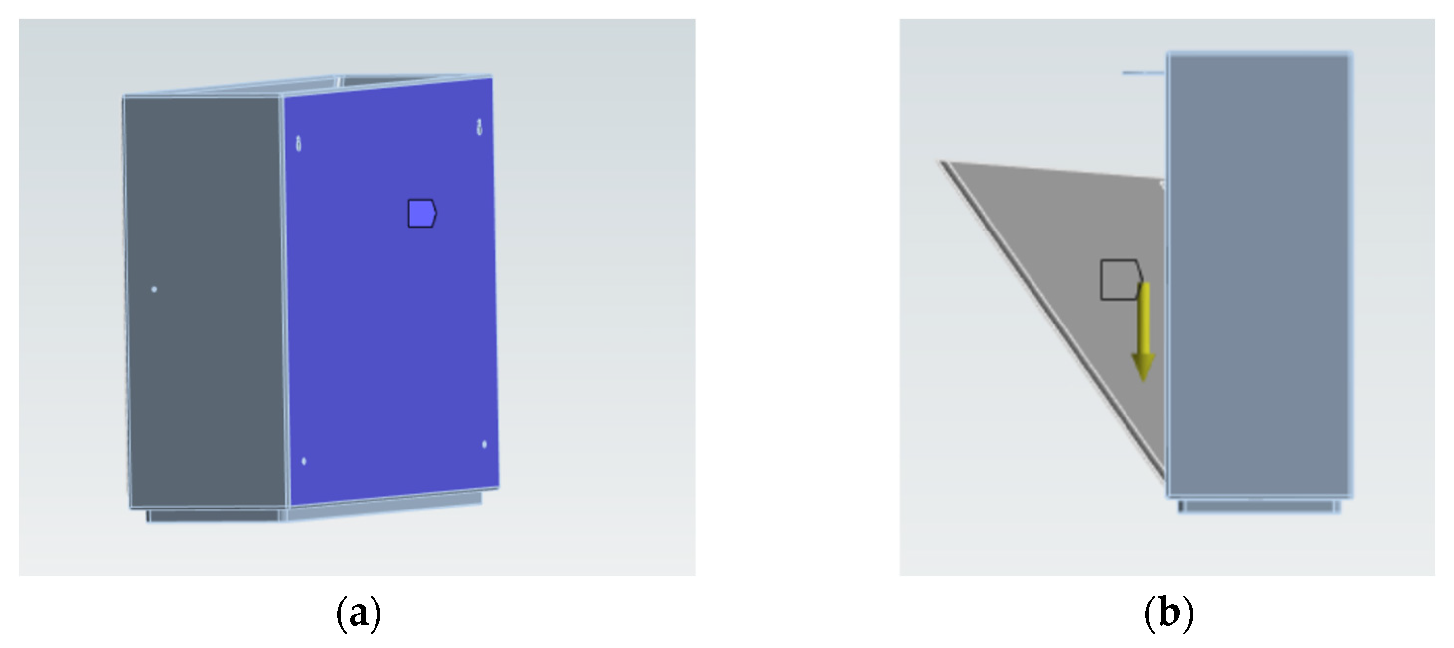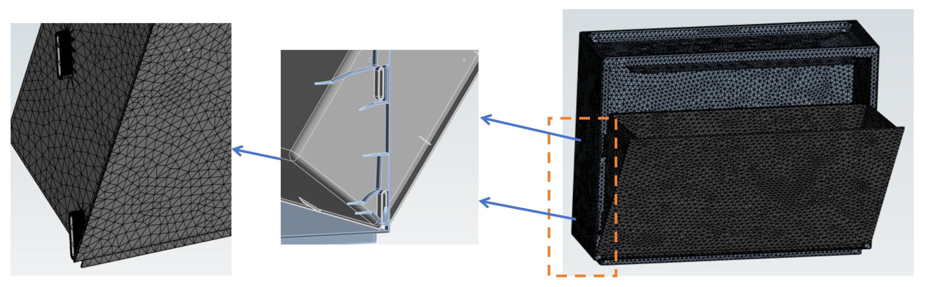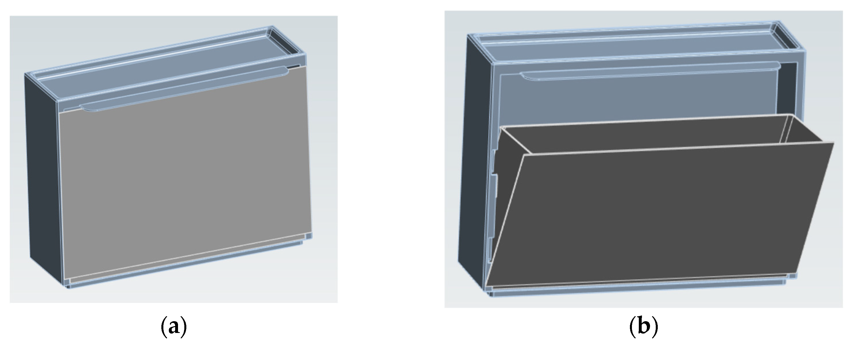 - The experimental results of the load-bearing limit of the shoe box show that the failure load in the open state is 13.2–15.4 kg, which is manifested as the fracture of the lower buckle and the slipping of the inner liner. In the finite element simulation, when the load reaches 13.5 kg, the stress of the lower buckle is close to the flexural strength of RPP, and the local strain exceeds the fracture elongation. The possible reasons for the slight discrepancies between the experimental results and the finite element results are as follows: