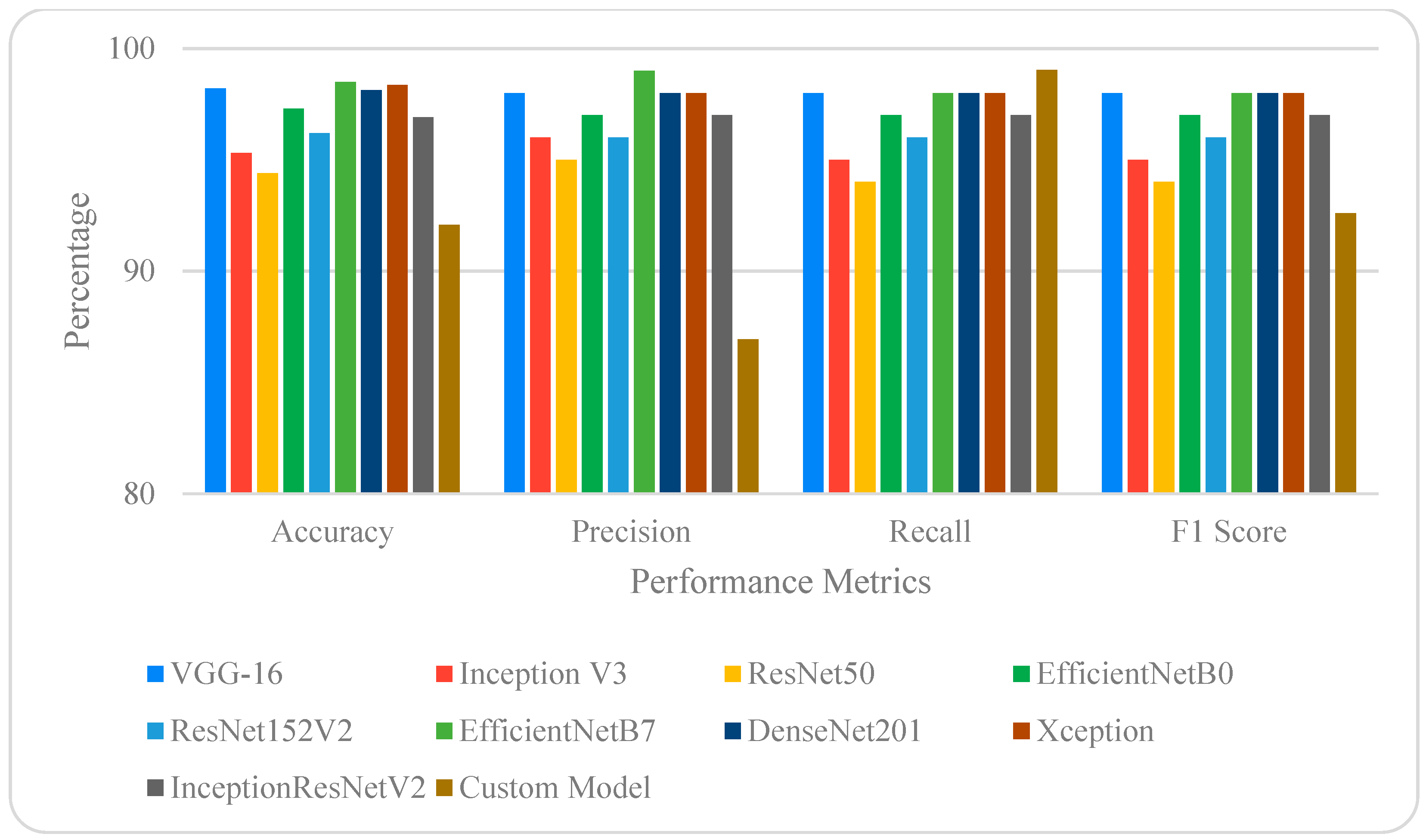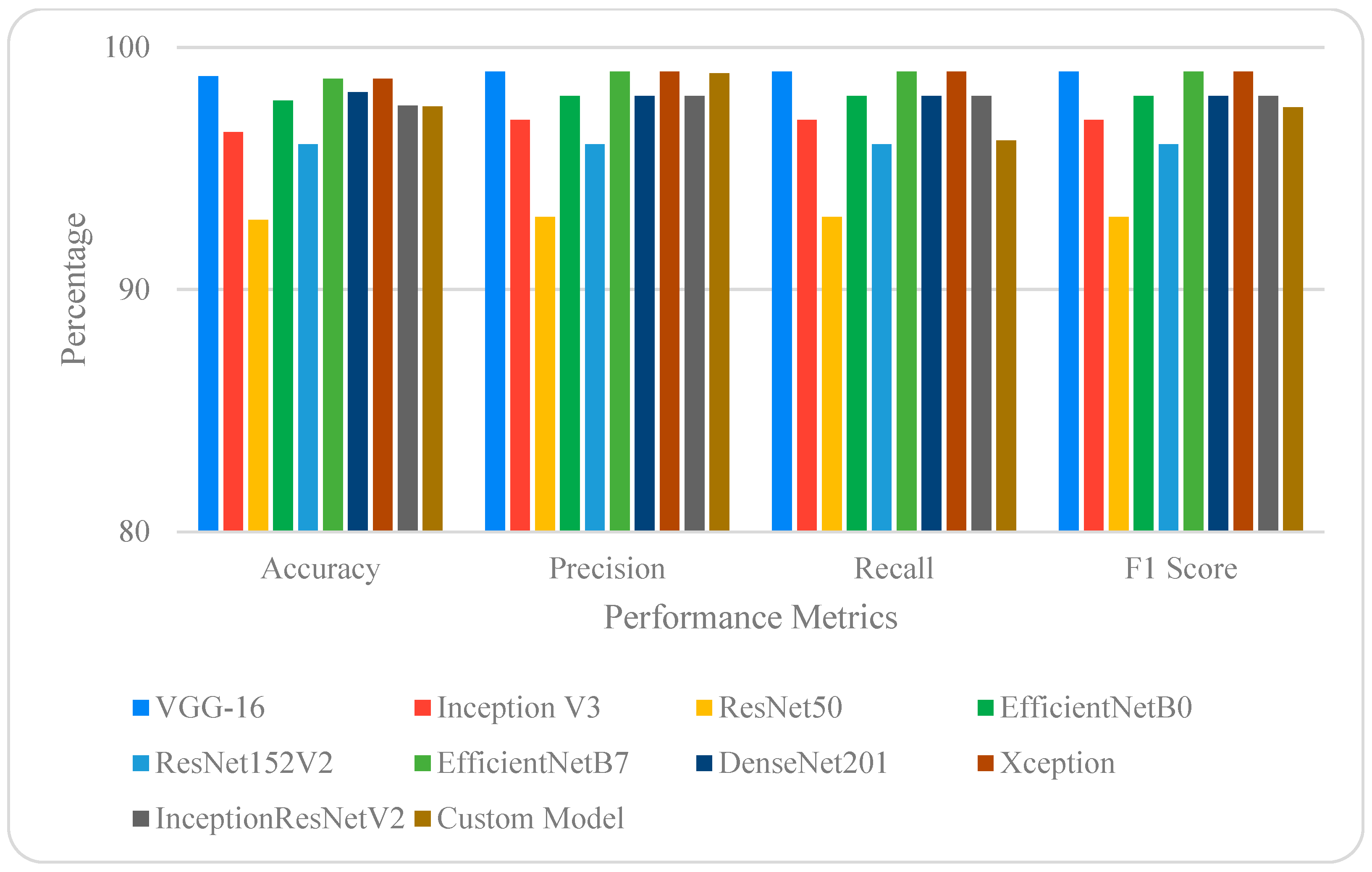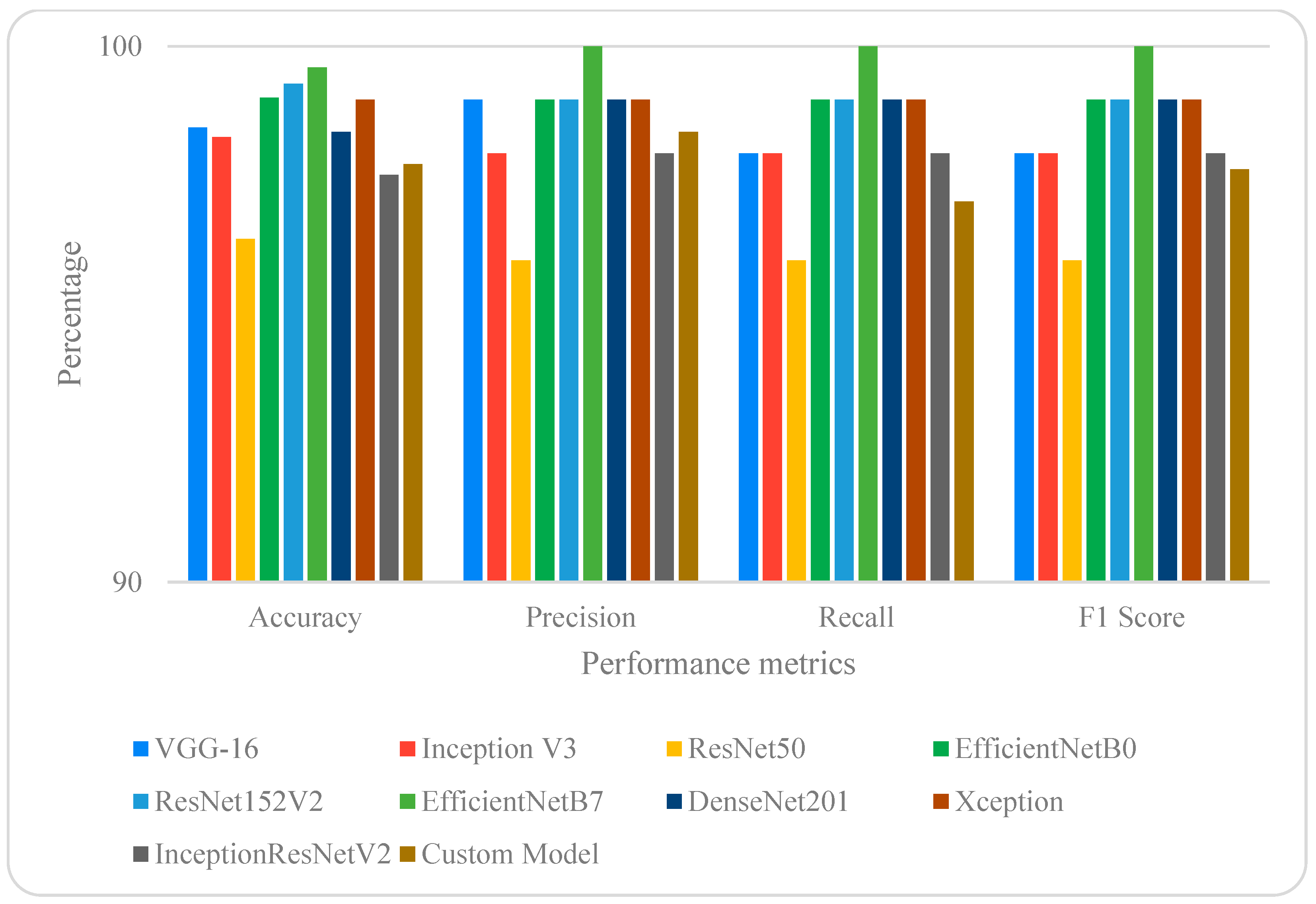 - Among all models, EfficientNet-B7 outperformed the rest, achieving 99.6% accuracy and perfect scores (100%) across all metrics on the baseline dataset. Other strong performers included Xception, EfficientNet-B0, and DenseNet-201. Except for ResNet50, all pre-trained models surpassed the custom CNN.