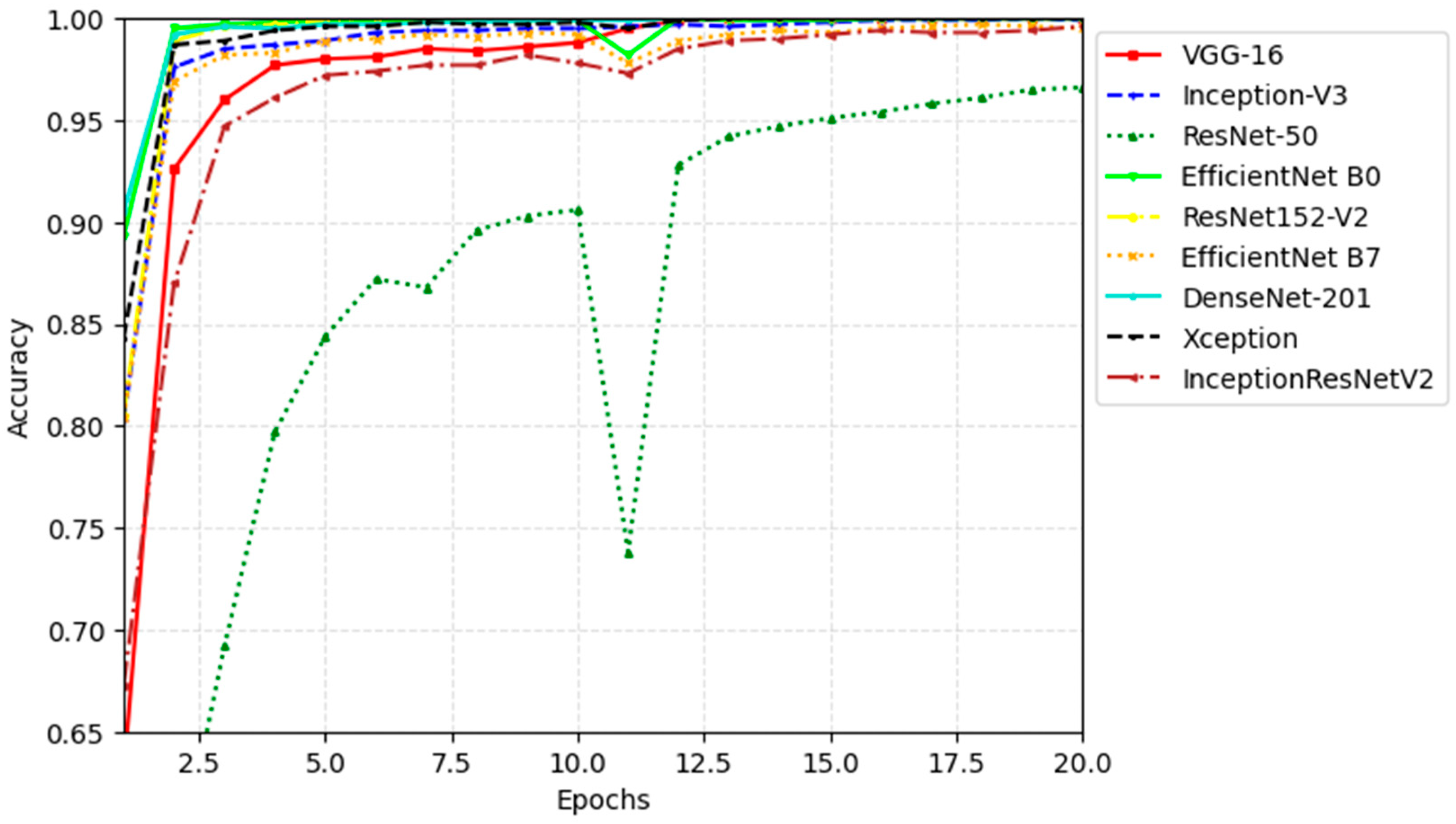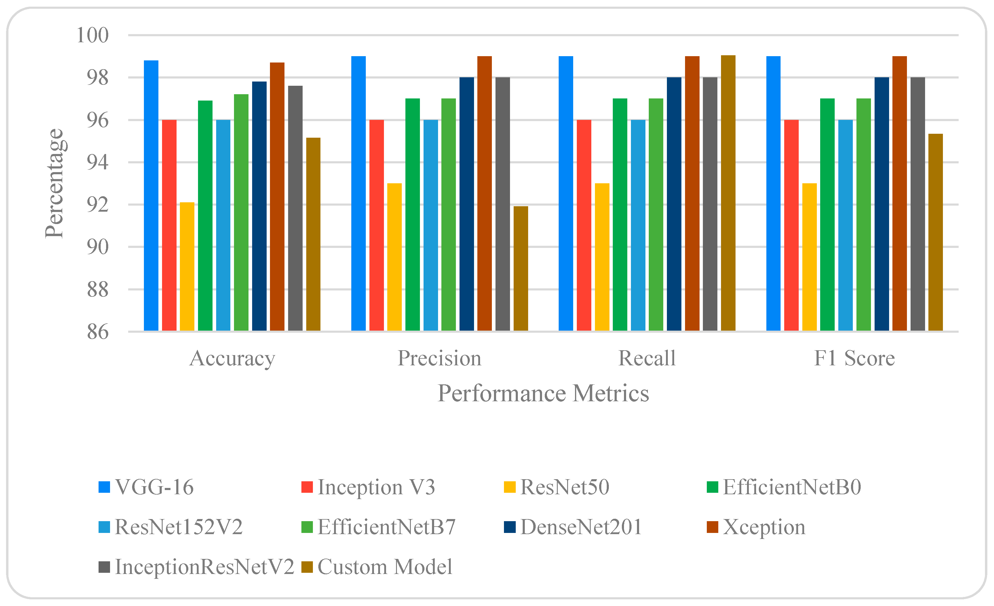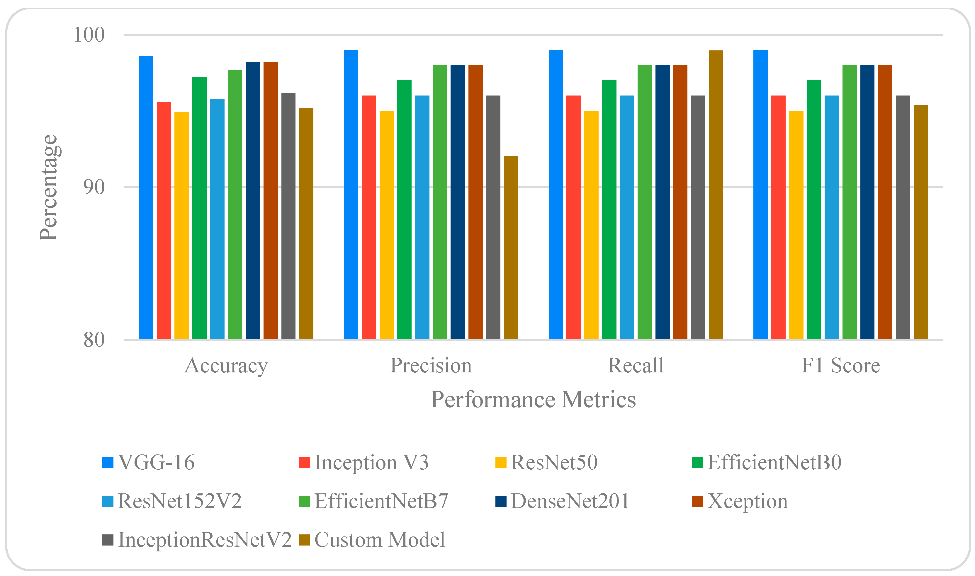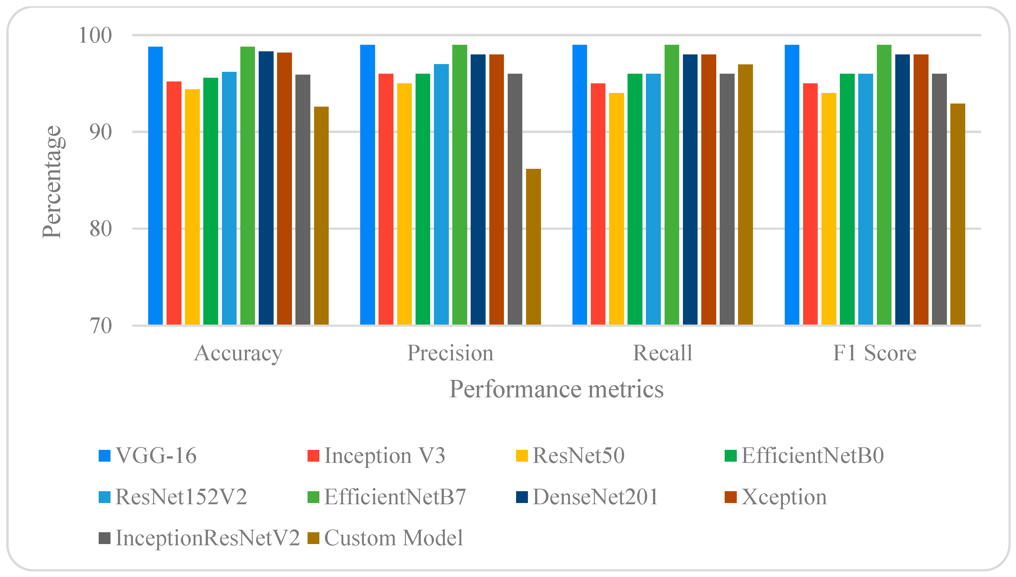 - Among all models, EfficientNet-B7 outperformed the rest, achieving 99.6% accuracy and perfect scores (100%) across all metrics on the baseline dataset. Other strong performers included Xception, EfficientNet-B0, and DenseNet-201. Except for ResNet50, all pre-trained models surpassed the custom CNN.