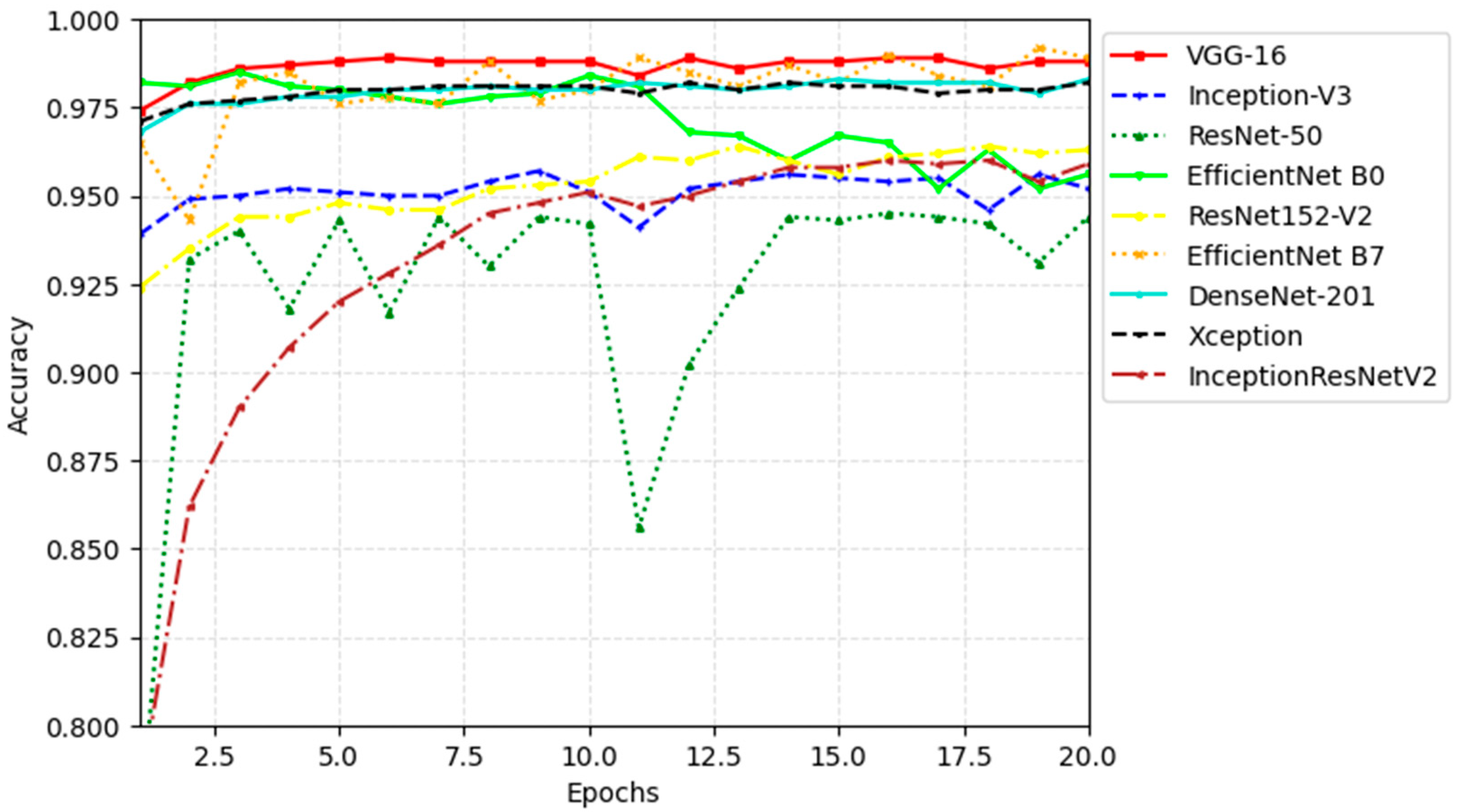 - Across all augmentation techniques, VGG-16, Xception, EfficientNet-B0, EfficientNet-B7, and DenseNet-201 consistently ranked highest in performance. Notably, VGG-16 maintained 99% across all key metrics regardless of the augmentation type.