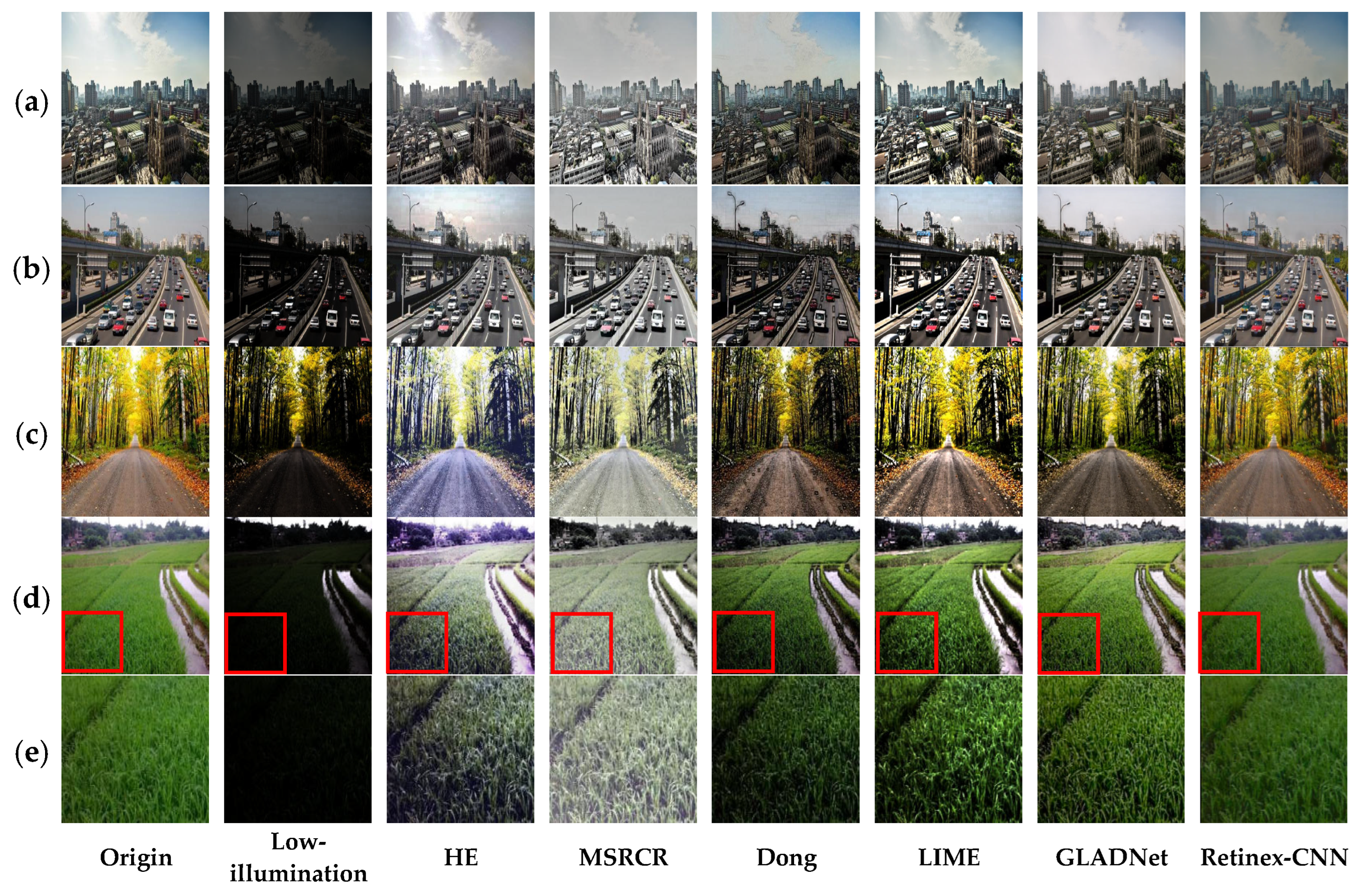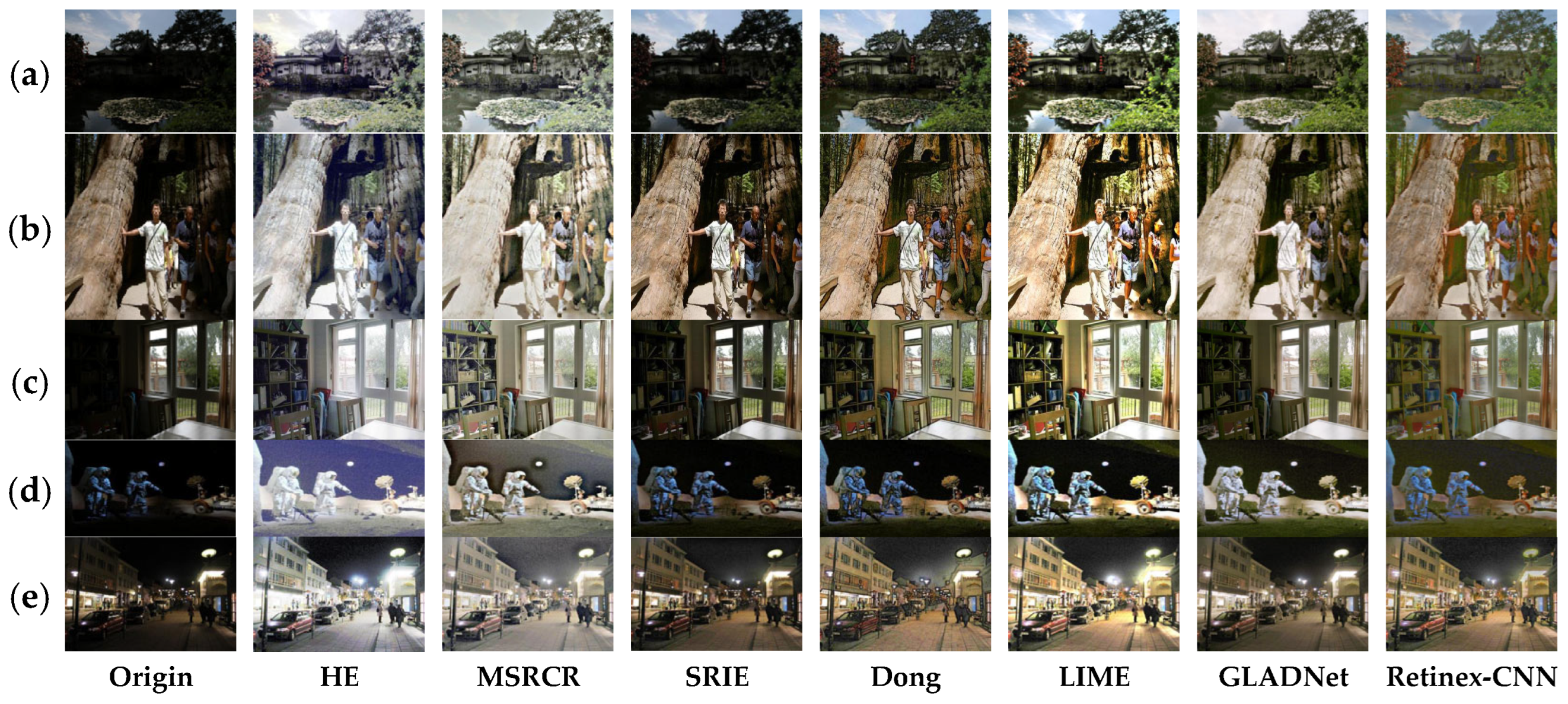 | Origin | HE | MSRCR | SRIE | Dong | LIME | GLADNet | Retinex-CNN | |