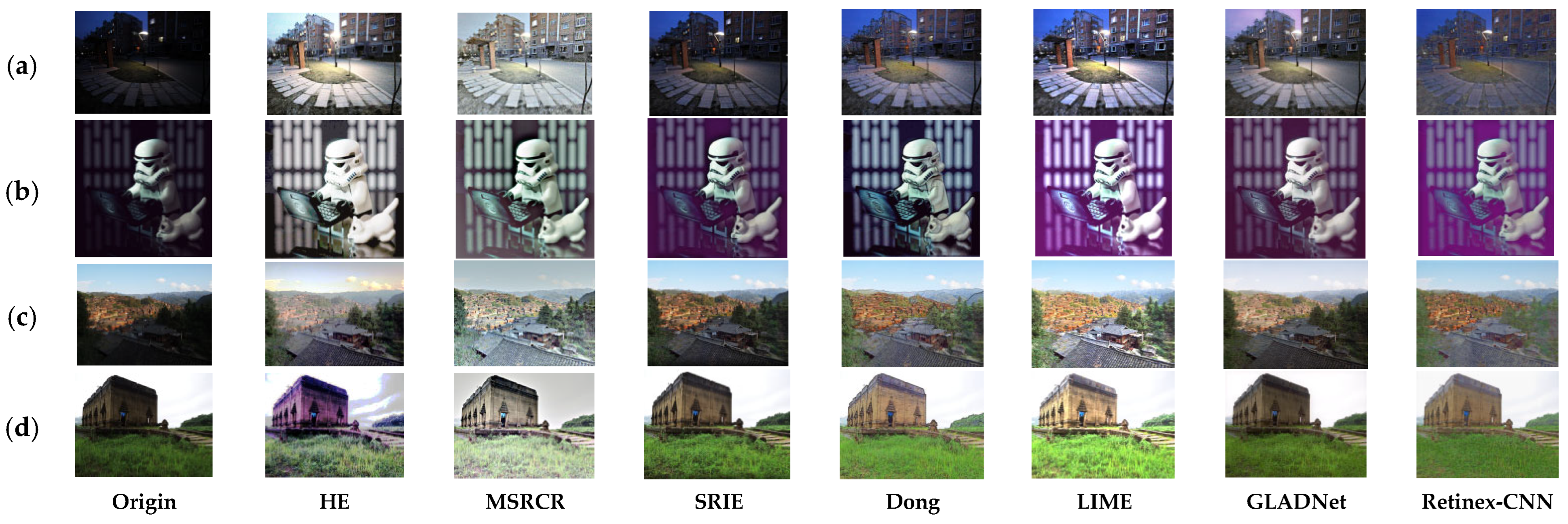 - Wang, W.; Wei, C.; Yang, W.; Liu, J. Gladnet: Low-light enhancement network with global awareness. In Proceedings of the 2018 13th IEEE International Conference on Automatic Face & Gesture Recognition (FG 2018), Xi′an, China, 15–19 May 2018; pp. 751–755. [Google Scholar]