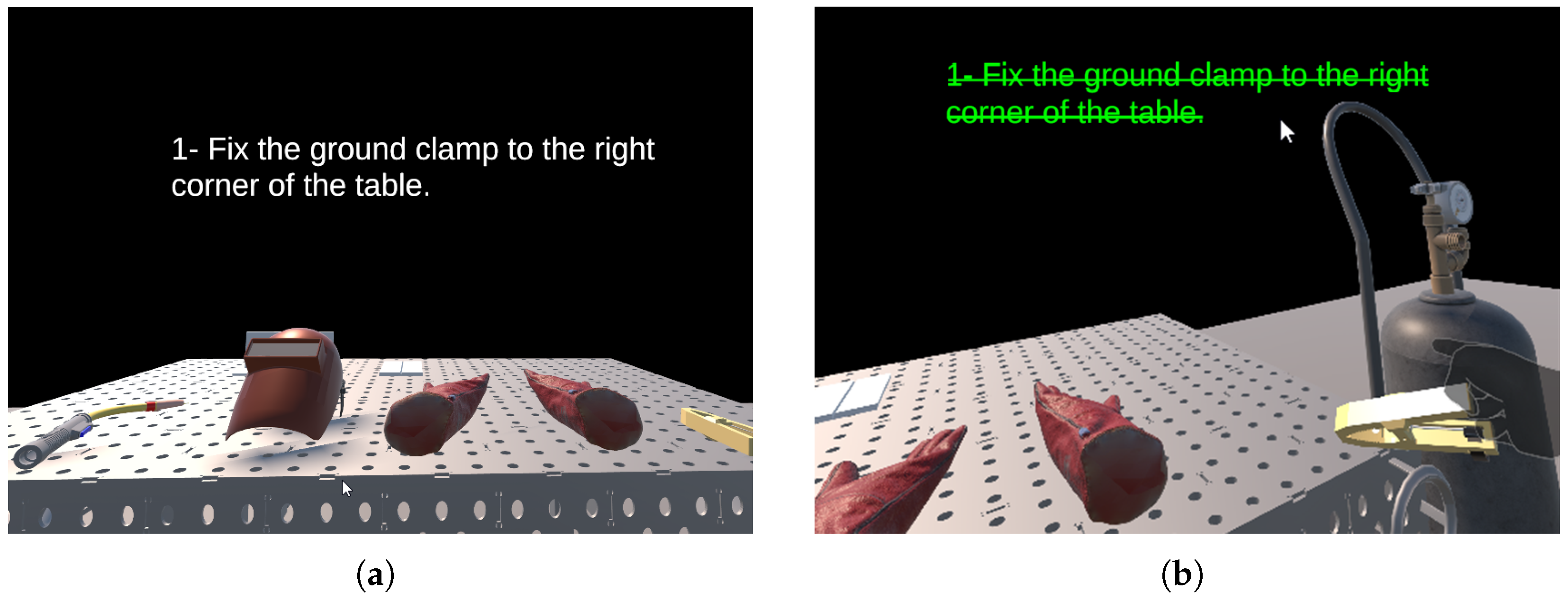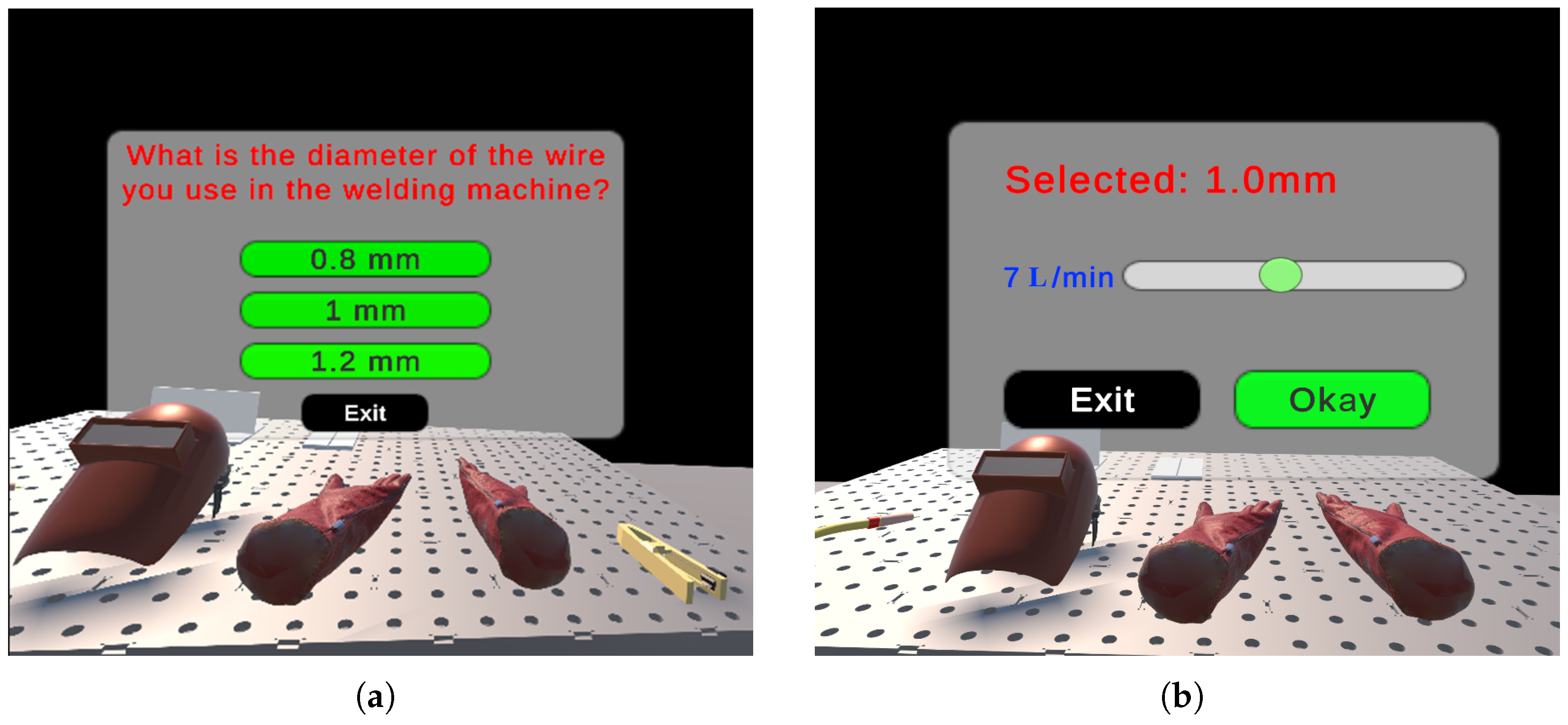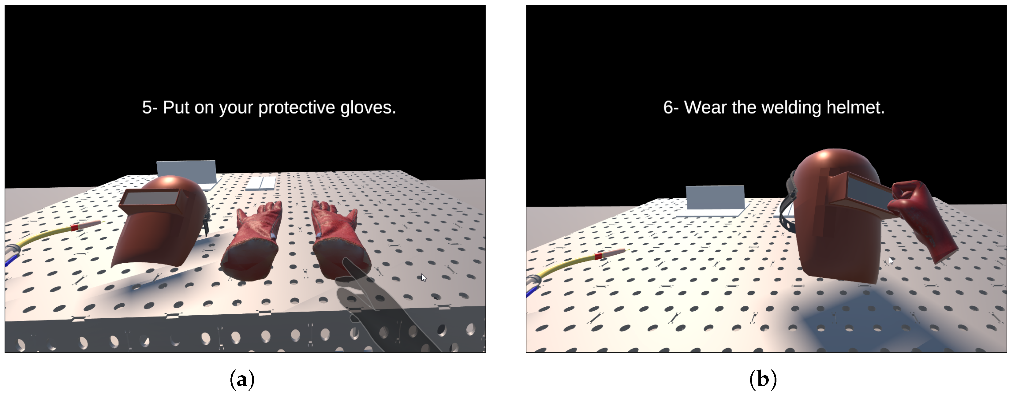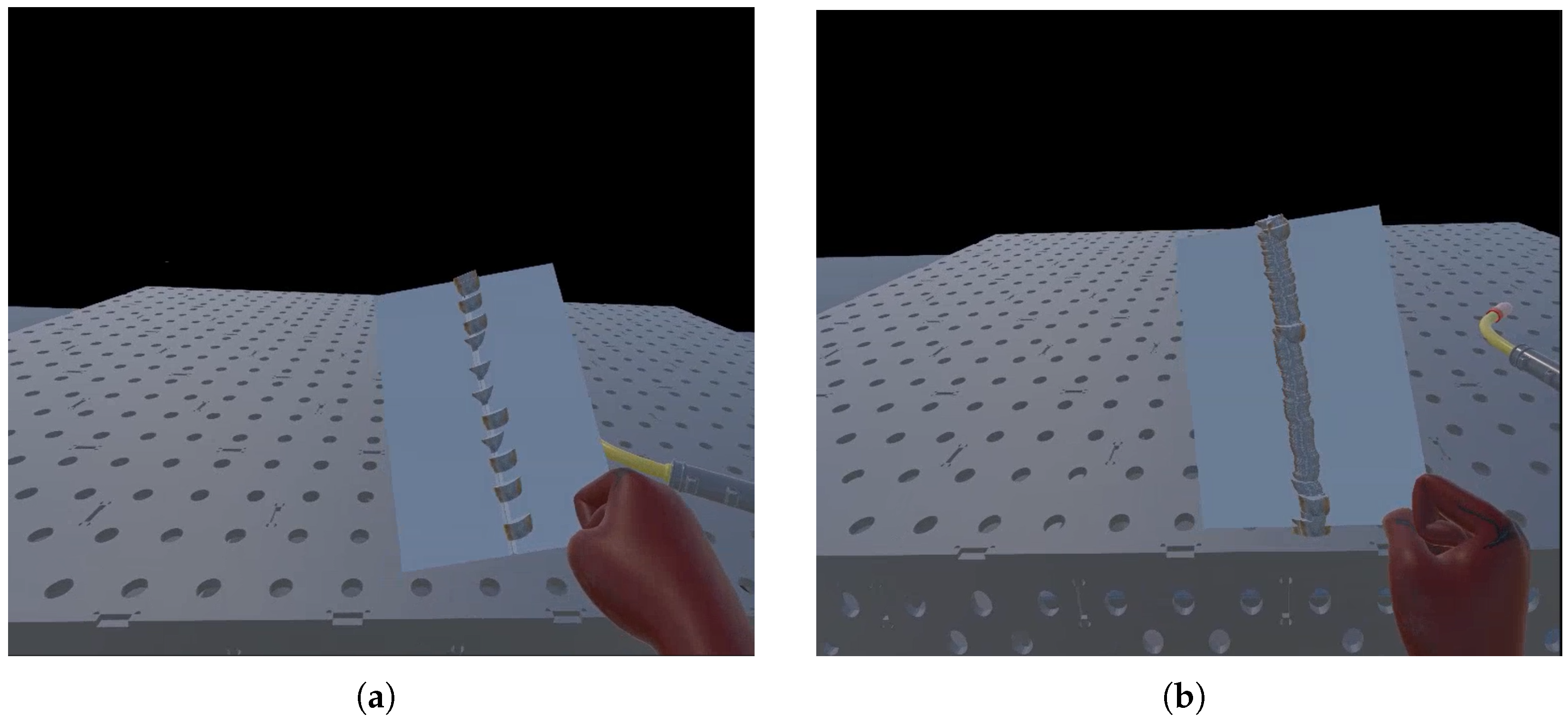 However, one potential limitation frequently highlighted in the literature on VR-based training is the possibility of inducing overconfidence due to the inherently risk-free nature of the virtual environment. To address this concern, the developed system integrates haptic safety feedback. Specifically, during welding practice, when the user’s virtual hand meets the workpiece, the controller delivers vibration feedback that simulates potential hazards. This design choice reinforces occupational safety awareness by reminding learners of the risks associated with inappropriate hand positioning, thereby preventing unrealistic perceptions of invulnerability while still supporting confidence development.