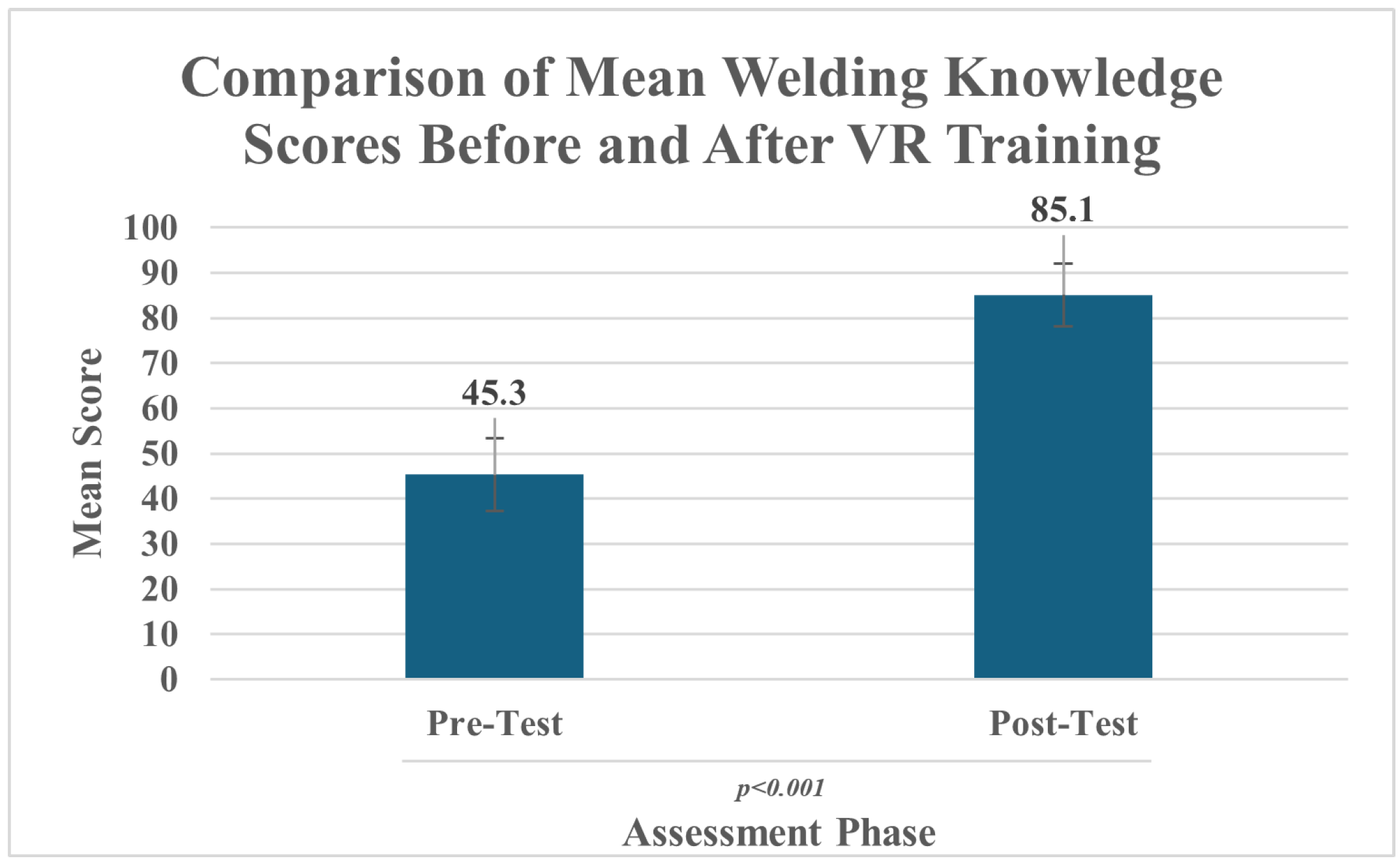 The results demonstrated substantial improvements in both theoretical welding knowledge and practical understanding of machine operation. A paired-sample t-test confirmed that the increase in theoretical knowledge was statistically significant (, ).