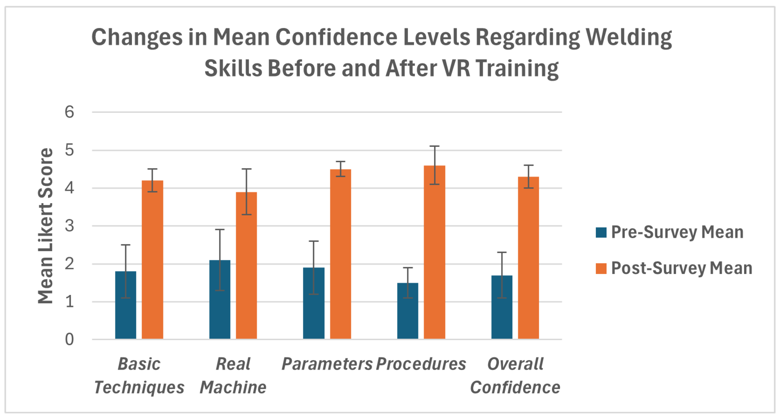Figure 11, pre-survey results indicated low self-confidence across welding tasks, with mean scores ranging from 1.5 to 2.1. Following the training, confidence levels increased significantly, reaching post-survey mean scores of 3.9 to 4.6. This improvement underscores the role of VR as a safe and repeatable practice environment that allows learners to experiment, make mistakes without material or safety consequences, and gradually build self-efficacy. These outcomes reinforce previous studies highlighting VR’s potential to strengthen learner confidence in skill acquisition [