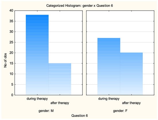 The chi-square test of independence was used, taking into account the data from Figure 1 to check whether the stage of treatment depended on gender (Table 1). It was found that the stage of treatment at which the respondent was did not depend on gender.