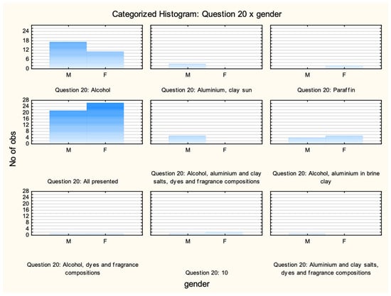 Respondents in as many as 69 cases considered that the cosmetic treatments listed should not be used. 13 people considered massage as acceptable, and 11—pedicure and manicure. Only three people considered that more than one treatment can be used. These were: massages, enzymatic peelings, manicure, and pedicure. Comparing the results of the responses by gender, we can see that: