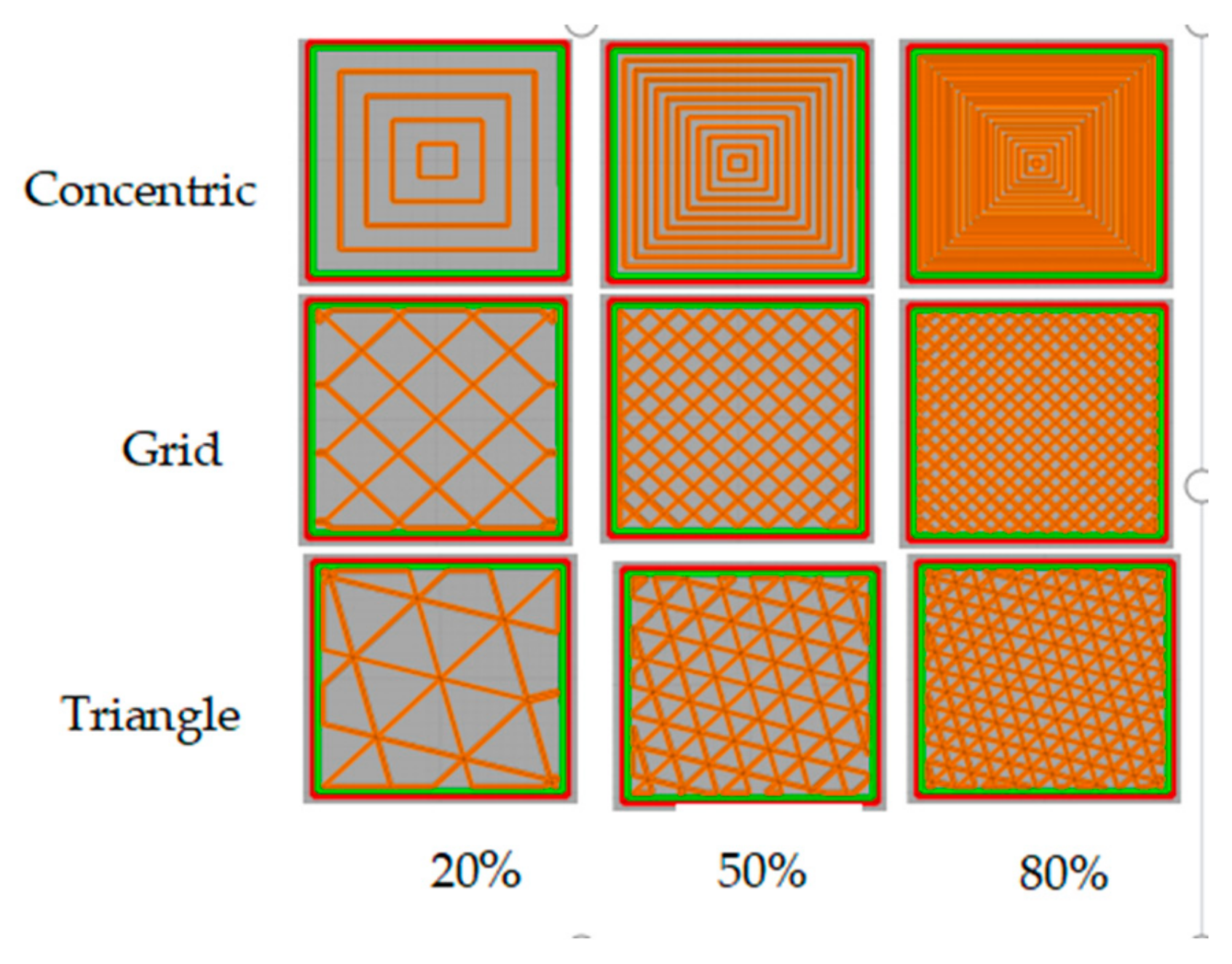 - The “triangle” pattern with 80% infill density is recommended for printing when compared with 100% infill density because the difference in results is very small; this reduces cost and weight when using 80% infill density.