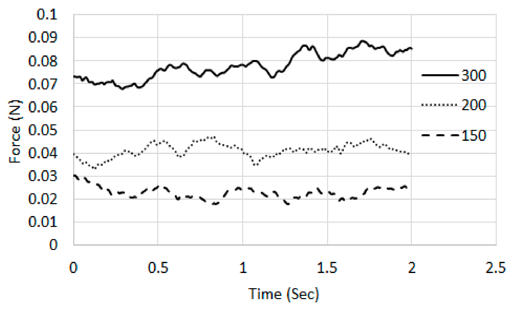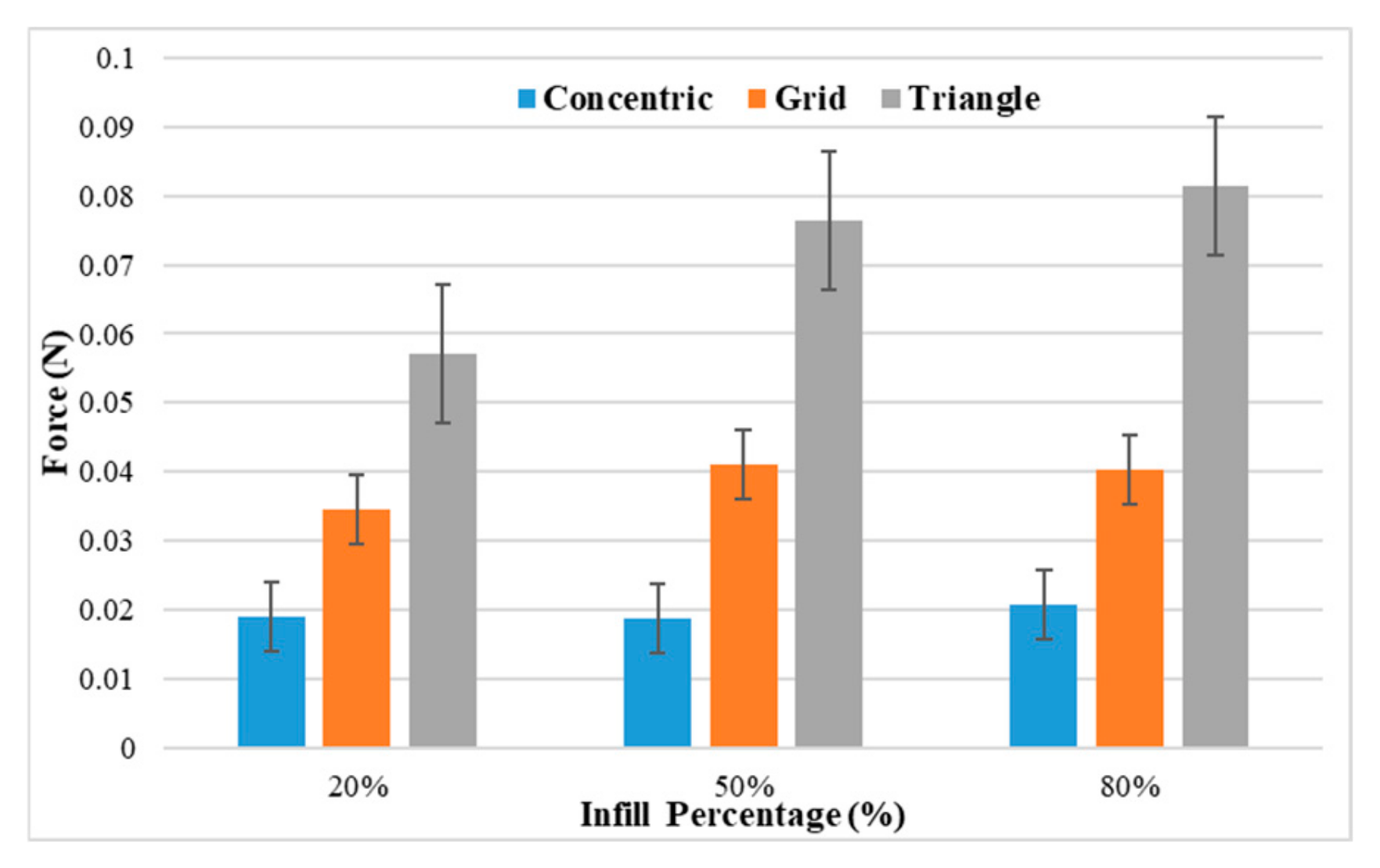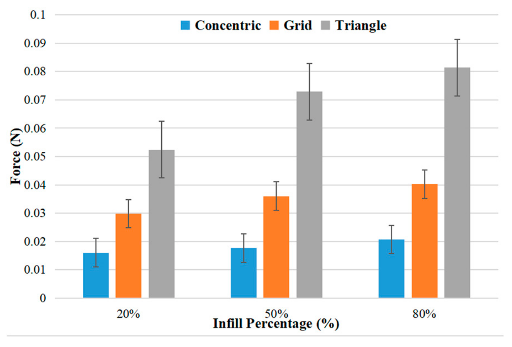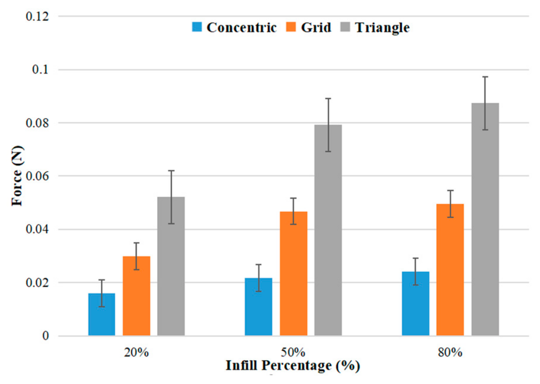- The “triangle” printing pattern results in the highest force. It creates a “truss-like” structure which is efficient for carrying loads because the resulting forces act as axial tension along the filament lines. The “grid” pattern, which is composed of square shapes, is less efficient because these shapes are deformed by filament bending at the joints, which results in less stiffness and resulting force. The “concentric” pattern shows the lowest force because this pattern acts as multiple unsupported rings, which have the lowest stiffness and resulting force. At 80% infill and 300 rpm, the force resulting from the “triangle” pattern was 0.087 N, which is 3.6 times greater than the force of the “concentric” pattern (0.024 N).