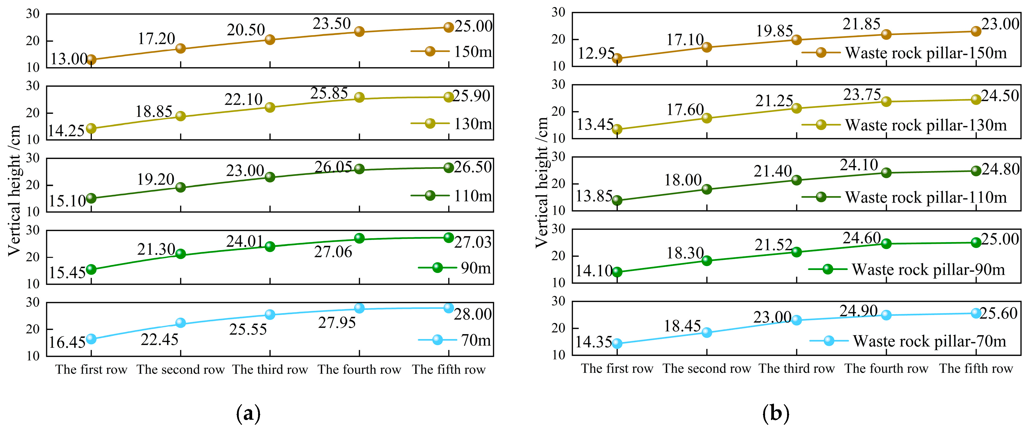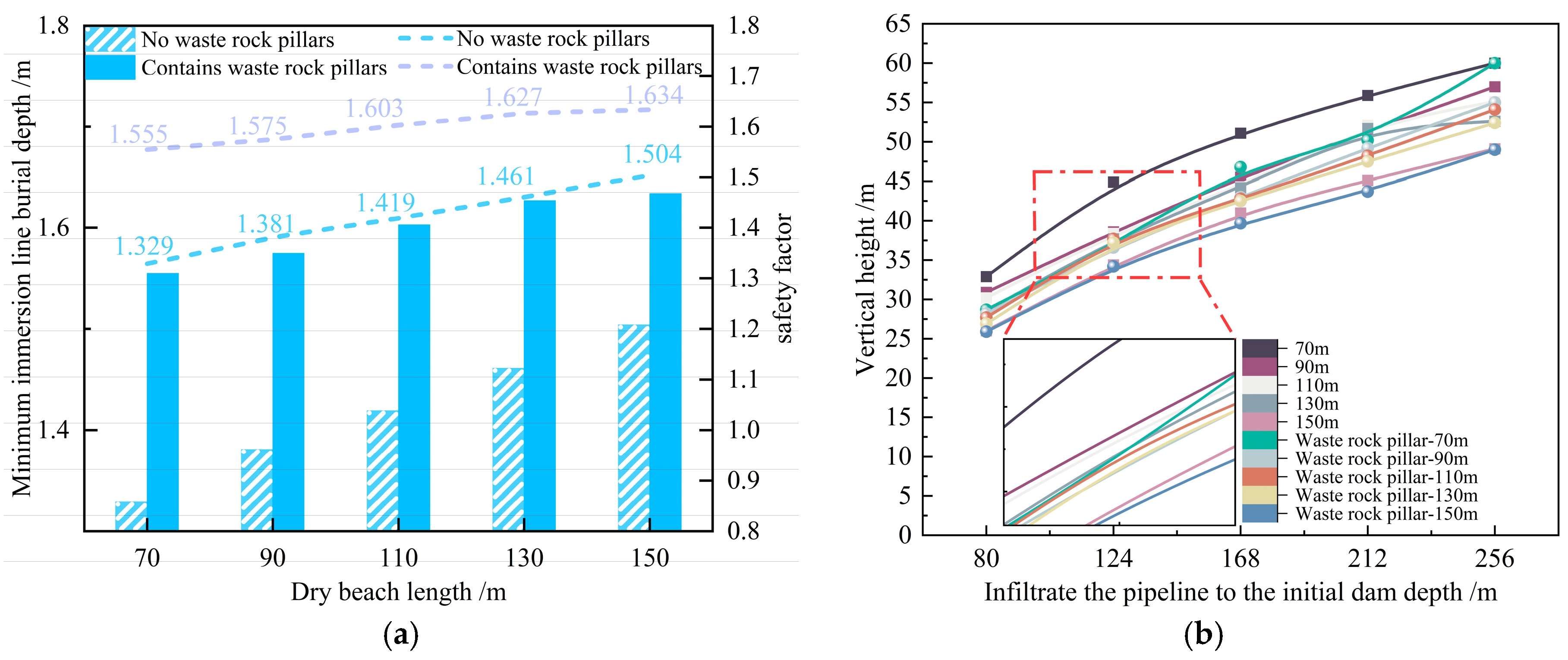 - For tailings dams without waste rock pillars, reducing the dry beach length from 150 m to 70 m caused the phreatic line to rise by 3.00–5.25 cm in the physical model. In contrast, dams incorporating waste rock pillars showed a smaller rise of only 1.35–3.15 cm under the same conditions. These results demonstrate that the proposed structure effectively deepens the burial depth of the phreatic line