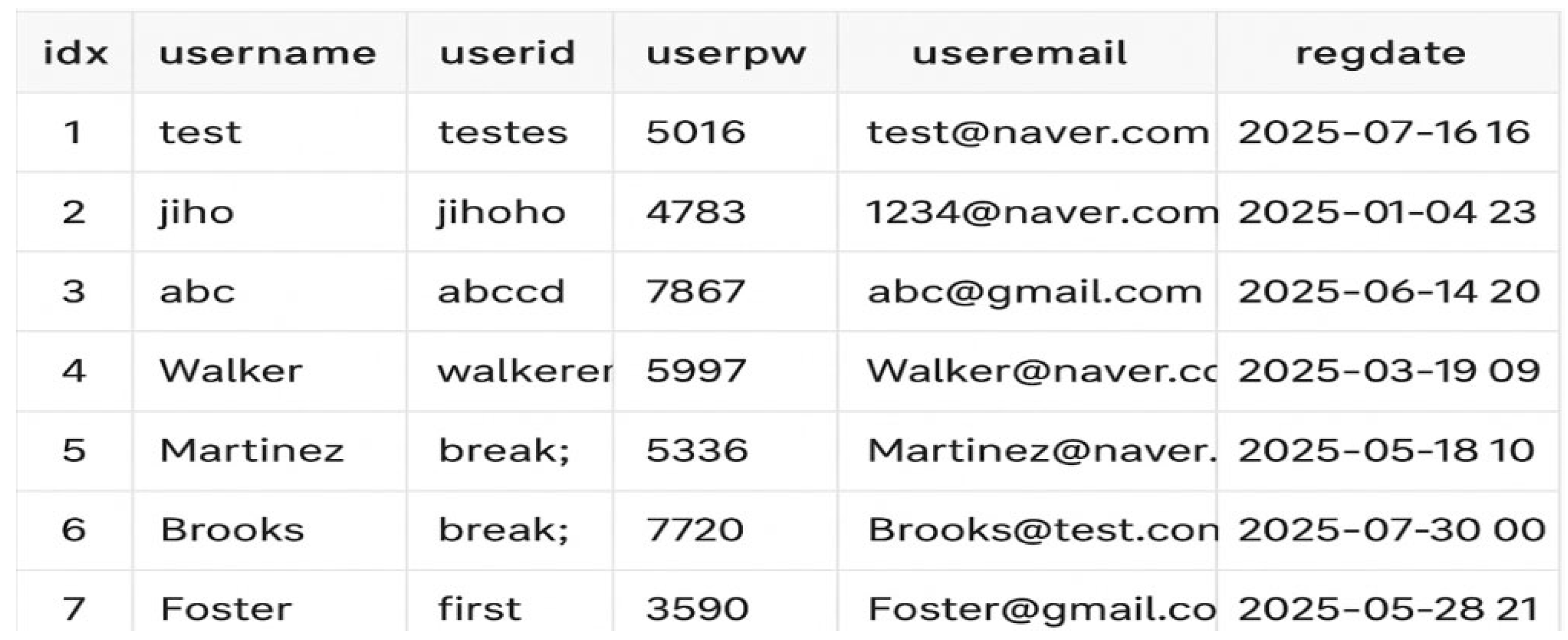 | 1: Establish PDO connection with host, database name, charset, and credentials 2: Set the PDO error mode to ERRMODE_EXCEPTION 3: Read input userid from the HTTP request 4: Prepare SQL query: SELECT * FROM member WHERE userid = : userid 5: Bind parameter : userid with the input value (string type) 6: Execute the prepared statement 7: Fetch the query result 8: If a record exists, return the result; otherwise, return “not found.” |