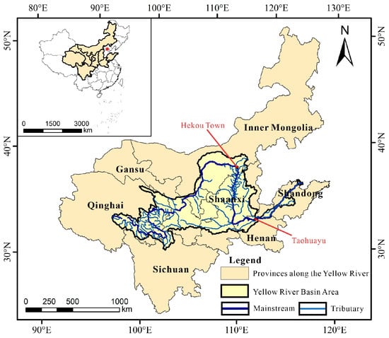 The Yellow River Basin (natural hydrological scale) spans about 1900 km from west to east and is one of the major river basins in China. It originates from the Bayan Har Mountains in Qinghai Province. The river flows through four major natural geographic regions: the Qinghai-Tibet Plateau, the Inner Mongolia Plateau, the Loess Plateau, and the North China Plain. It involves nine provinces and autonomous regions: Qinghai, Sichuan, Gansu, Ningxia, Inner Mongolia, Shaanxi, Shanxi, Henan, and Shandong [25]. This study selects these nine provinces (regions) as the research object, based on the natural scope of the Yellow River Basin. This choice also considers the direct link between the basin and these administrative regions in terms of resource development, ecological protection, and economic growth. The demarcation points for the upper, middle, and lower reaches reference the standards set by the Yellow River Basin Flood Control Plan. Specifically, it uses Hekou Town and Taohuayu [26] as boundaries. In this paper, the “Yellow River Basin” refers to two spatial scales. First, the “Yellow River Basin Area” at the natural hydrological scale includes the main river, its tributaries, and endorheic areas, thus covering the full catchment area. Second, the “Nine Provinces (Regions) along the Yellow River” at the administrative scale refers to the provinces (regions) traversed by the river and its major tributaries: Qinghai, Sichuan, Gansu, Ningxia, Inner Mongolia, Shaanxi, Shanxi, Henan, and Shandong (see Figure 1). This study considers both the natural basin and administrative divisions. Unless otherwise stated, “Yellow River Basin” mainly means these nine provinces (regions) along the river.