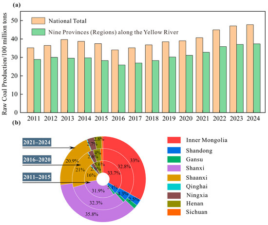 Statistics of coal production in the Yellow River Basin: (a) Trend of coal production; (b) Proportion of coal production in the Yellow River Basin.