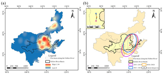 Spatial pattern of coal development in the Yellow River Basin: (a) Mining area density analysis; (b) Standard deviational ellipse of coal development.