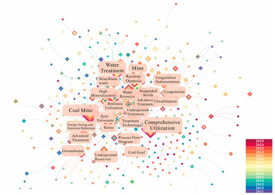 The keywords are the highly condensed topics of the research in the paper. The keywords are statistically analyzed by using the keyword co-occurrence function in Citespace. Considering that “mine water” is a core keyword, it is meaningless for the analysis of the research content and was therefore eliminated. The co-occurrence analysis results of the screened literature are shown in Figure 7. In terms of overall frequency, “Coal Mine” is the most frequently mentioned keyword (75 times), reflecting that the research on mine water treatment in the Yellow River Basin is highly focused on the coal industry scenario. “Comprehensive Utilization” and “Water Treatment” ranked second and third with 61 and 55 times, respectively, indicating that the utilization of mine water resources and pollution control are the core research topics. The frequency of the terms “Reverse Osmosis” and “Advanced Treatment” appearing 52 and 35 times, respectively, indicates that advanced membrane treatment technologies remain one of the mainstream technical paths at present. In the direction of “Resource Utilization”, keywords such as “High Mineralization”, “Mine Wastewater”, and “Reuse” frequently appear, highlighting the need to address the complexity of water quality. The total frequency of the keywords related to “Coagulation Technology” exceeding 30 times indicates that the removal of suspended solids in mine water remains an important issue that must be addressed. “Energy conservation and emission reduction” has been a research hotspot guided by policies, with the keyword frequency exceeding 20 times in total, reflecting the guiding role of the green development concept in the direction of mine water treatment. “Optimization” has become an important keyword for enhancing the system’s operational efficiency and improving processes, covering multiple sub-items such as “Optimized Design” and “Optimized Configuration”. Overall, the high-frequency aggregation of keywords indicates that current research mainly focuses on improving water treatment technology, exploring resource utilization paths, and developing green and low-carbon strategies in the context of coal mines. This provides a clear research foundation and development direction for the subsequent integration and promotion of mine water treatment and comprehensive utilization technologies.