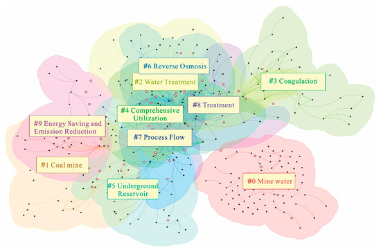 Based on keyword co-occurrence, CiteSpace’s clustering algorithm was applied to generate keyword clusters, from which the top 10 clusters were extracted. The final results are shown in Figure 8. The 10 clusters are as follows: #0 Mine water, #1 Coal mine, #2 Water treatment, #3 Coagulation, #4 Comprehensive utilization, #5 Underground reservoir, #6 Reverse osmosis, #7 Process flow, #8 Treatment, and #9 Energy conservation and emission reduction. The clustering modularity index (Q) of cluster analysis is 0.621. If it is greater than 0.3, it indicates that the network structure obtained by division is significant. The clustering profile index (S) is 0.903. If it is greater than 0.7, it indicates that the clustering results are efficient and reasonable. Both suggest that the results of the clustering analysis in this paper are convincing [42]. Meanwhile, partial overlaps among some clusters indicate a close interconnection between the research themes represented by different clusters. The results of keyword cluster analysis show that the research content related to mine water treatment and utilization in the Yellow River Basin mainly focuses on the following three aspects. (1) Research on Mine Water Treatment Technology and Process Optimization. This direction mainly focuses on the removal of suspended solids in mine water, the combined application of different treatment technologies, and the adaptability to the treatment of highly mineralized water bodies. The commonly used technologies at present are coagulation sedimentation, reverse osmosis, membrane separation, etc. In practical applications, they are gradually evolving towards high efficiency, low cost, and adaptability to complex water quality conditions. It is mainly reflected in cluster analysis of #2 (water treatment), #3 (coagulation), #6 (reverse osmosis), #7 (process flow), and #8 (treatment). (2) Exploration of the path for the utilization and comprehensive utilization of mine water resources. With the intensification of water shortage in the Yellow River Basin and the increasing requirements for ecological protection, the resource utilization of mine water has gradually become a research hotspot. The research focuses on the reuse of mine wastewater, the treatment standards, and matching technologies for different utilization scenarios (such as agricultural irrigation, industrial production, and ecological water replenishment), as well as the feasibility analysis of new utilization methods such as underground reservoirs. For instance, the recycling and reuse of mine wastewater, the construction and regulation and storage utilization of underground reservoirs, etc., reflect a transformation from single treatment to diversified utilization, mainly reflected in cluster analysis #4 (comprehensive utilization), #5 (underground reservoir), and #9 (energy conservation and emission reduction). (3) Research on regional management and practical applications centered on coal mines. This research category focuses on coal mining enterprises as the core units to explore management models and policy practices related to mine water discharge, treatment, and utilization. It emphasizes the optimization of mine water treatment systems, engineering applications of drainage reuse, and the green transition of coal mines under policy incentives. Through case studies of representative coal mines, these studies summarize regional experiences and limitations in mine water management and utilization, providing scientific support for coordinated water resource management at the regional level. This research focus is mainly reflected in clusters #0 (mine water) and #1 (coal mine).