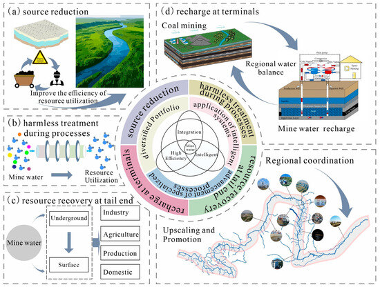 This study reviews the characteristics of coal development and mine water production in the Yellow River Basin, as well as research hotspots in mine water treatment and utilization. Based on the theoretical framework of the mine water full life cycle—source reduction, harmless treatment during processes, resource recovery at tail end, and recharge at terminals [43]—it proposes the development of an integrated, efficient, and intelligent system for mine water treatment and utilization. Future directions are outlined in three aspects: optimization of technological pathways, expansion of resource utilization, and establishment of coordination mechanisms (Figure 9).