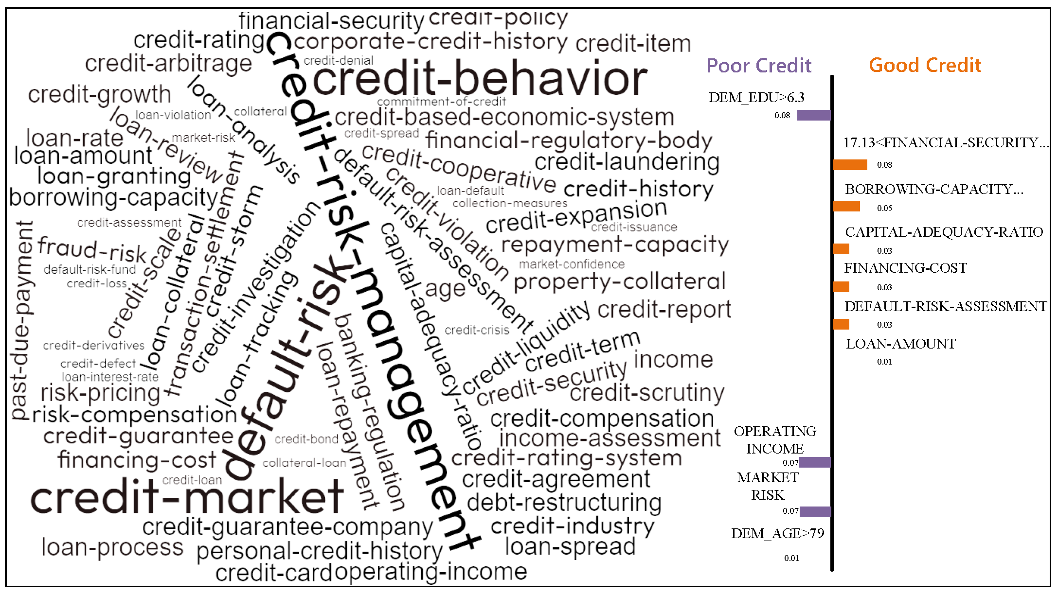 Figure 12. The term-frequency map reveals a distinct stratification of feature importance between borrowers with good and poor credit profiles. For high-risk (poor credit) applicants, the model’s predictions are predominantly driven by terms associated with credit-risk mitigation instruments and existing liabilities, such as credit guarantee, credit default, and credit liability. This suggests the model actively seeks safeguards and evaluates historical defaults when assessing applicants with weaker financial standing. Conversely, for low-risk (good credit) applicants, the model shifts its focus to features related to operational capacity and approved transactions, with terms like loan amount, loan granting, and borrowing capacity featuring prominently. This indicates that for credible applicants, the model prioritizes the scale and approval status of the requested credit. The high centrality and font size of the term collateral underscore its role as a critical, universal determinant bridging the assessment criteria for both borrower categories, aligning with fundamental credit risk management principles. This explanatory output not only validates the model’s adherence to logical financial reasoning but also provides a transparent, auditable trail for regulatory compliance.
