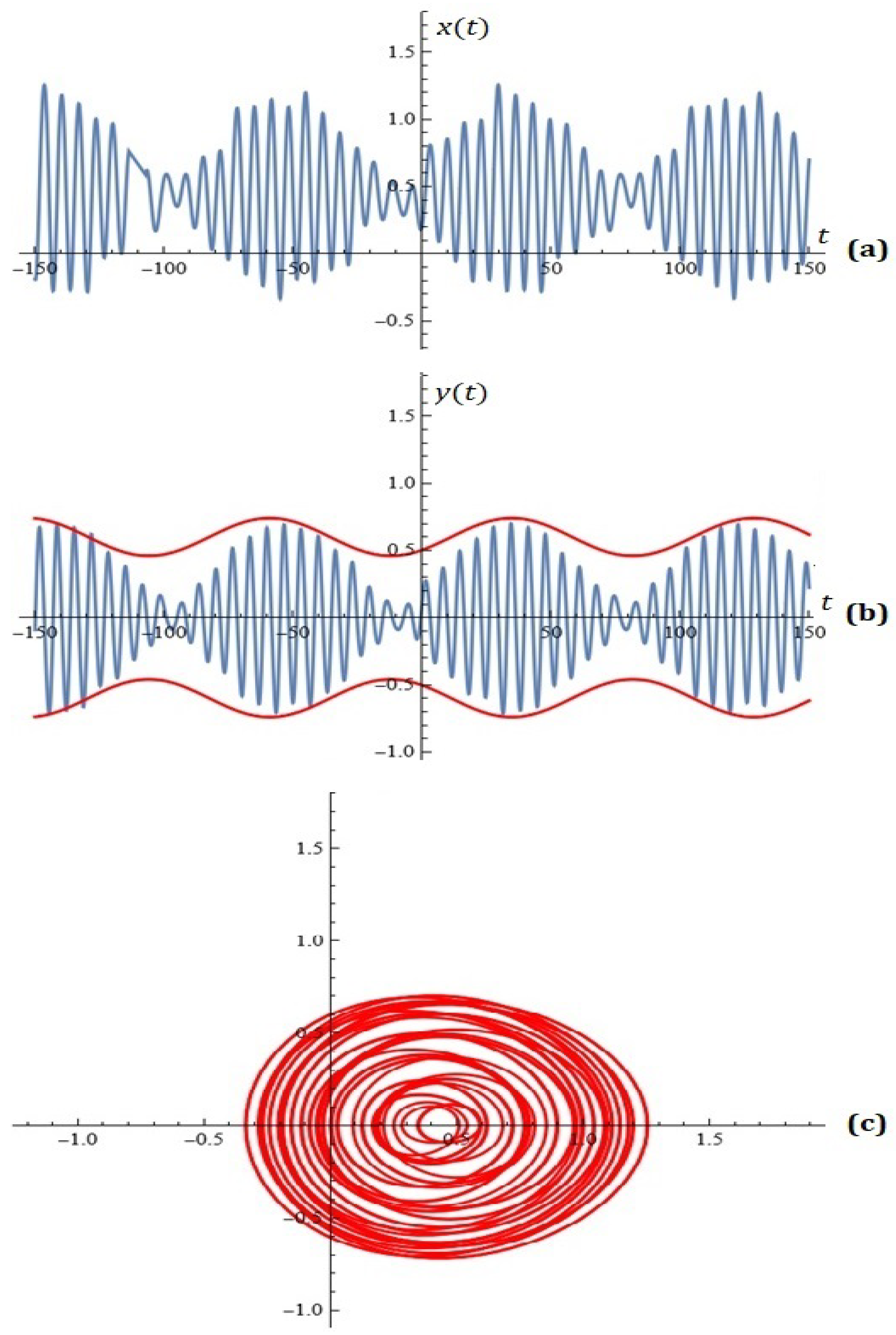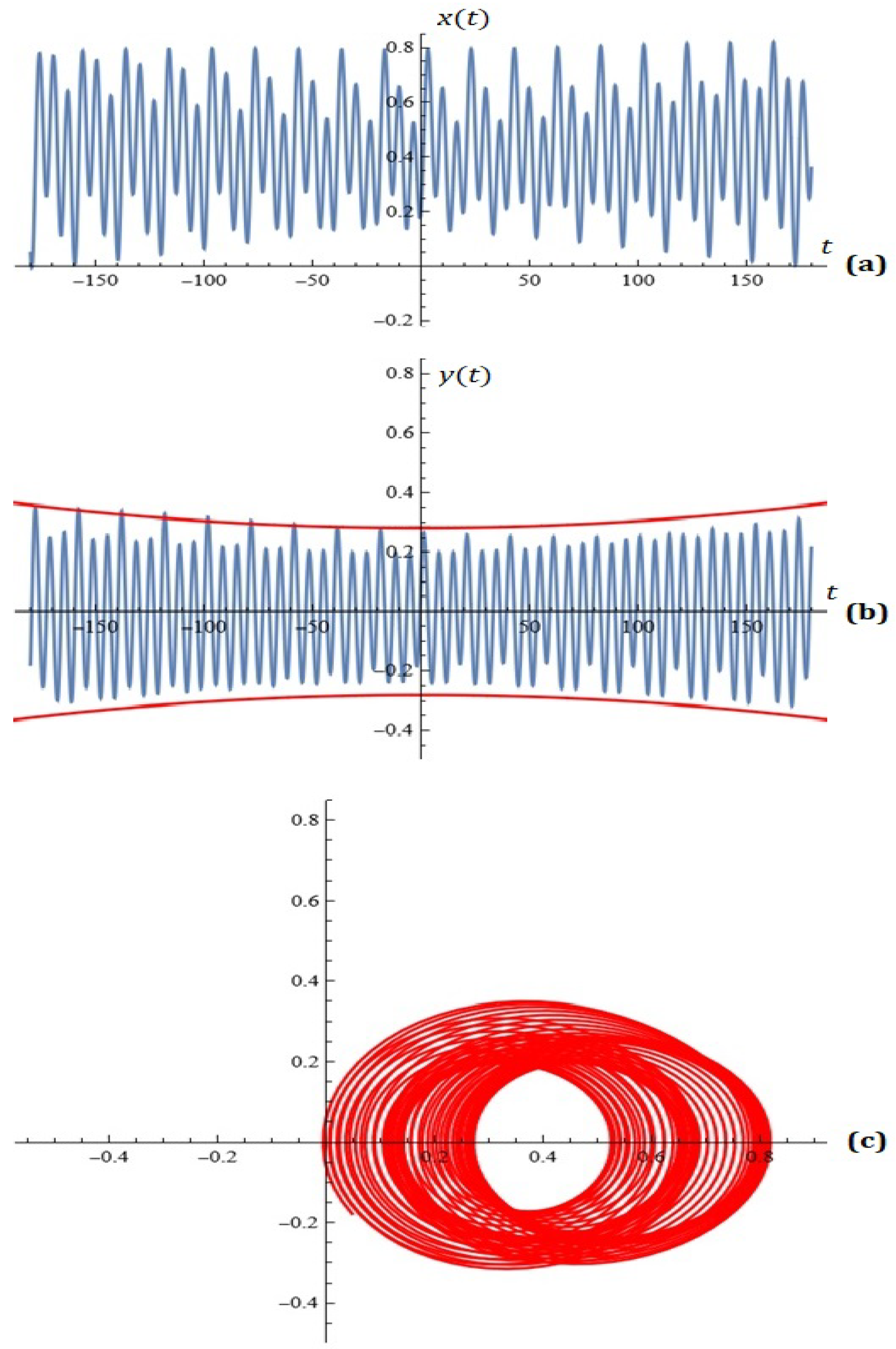 Figure 7. (a) x-component of the solutions of the system (2); (b) y-component of the solutions of the system (2); (c) phase space (Example 3).