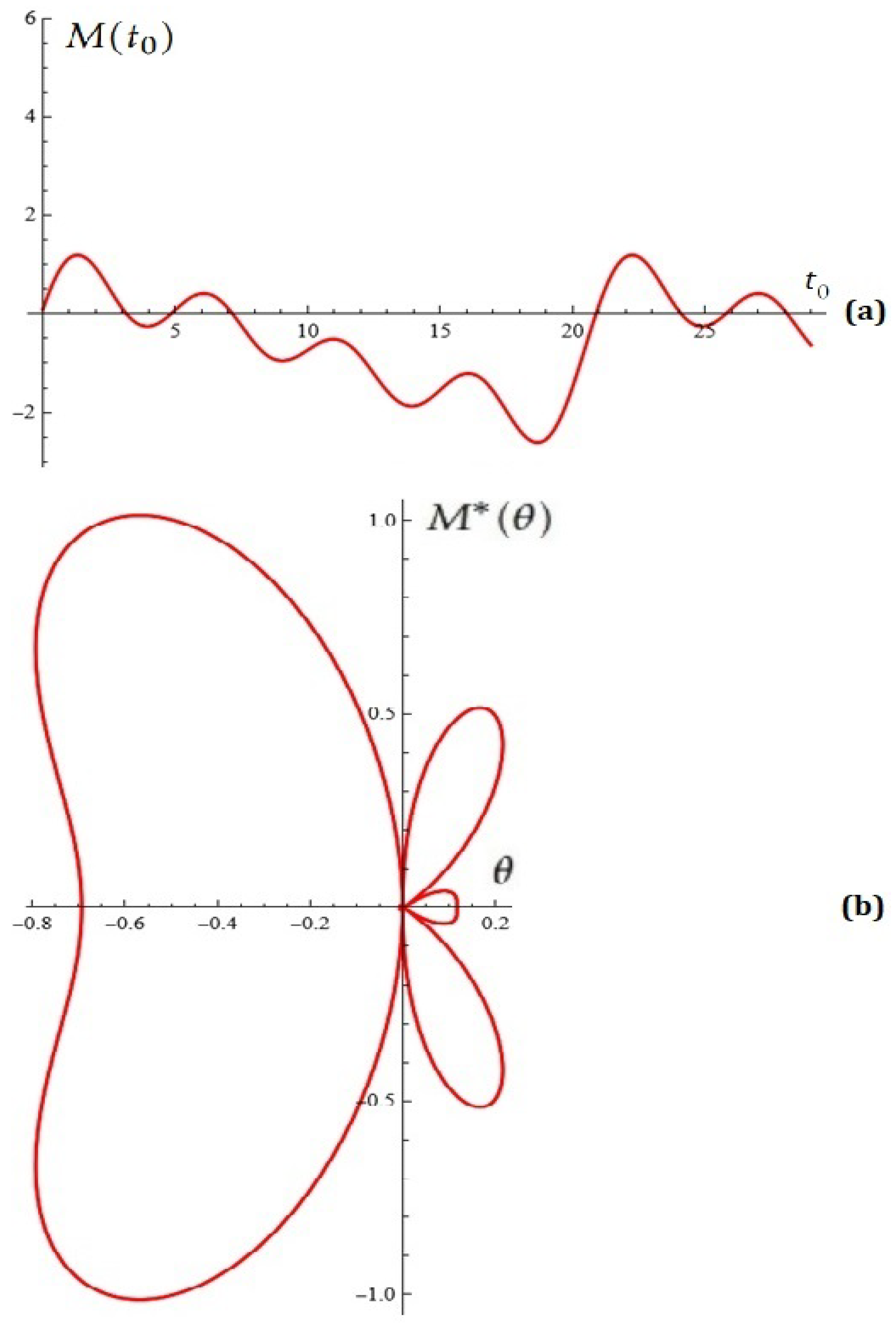 Figure 11. (a) Melnikov function M ( t 0 ) (Example 4); (b) Melnikov antenna factor (Example 5).