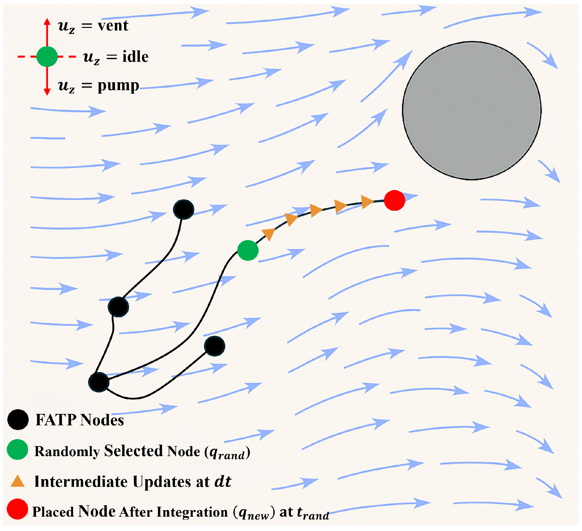 The proposed method utilizes a sampling strategy that operates directly in the control space. Specifically, instead of sampling random positions or velocities, the planner samples discrete control inputs. Each input is mapped to a vertical acceleration, which is used to forward integrate the vehicle’s motion for a given interval of time. After the motion is integrated, a new node for a search tree is created. This approach ensures that all generated trajectories are dynamically feasible, flow-aware, and naturally respect the reachability constraints imposed by the environment. Because the sampling process inherently considers the effects of the flow, it eliminates the need for artificial bounding of sampled positions or post-processing to remove invalid or unreachable trajectories [