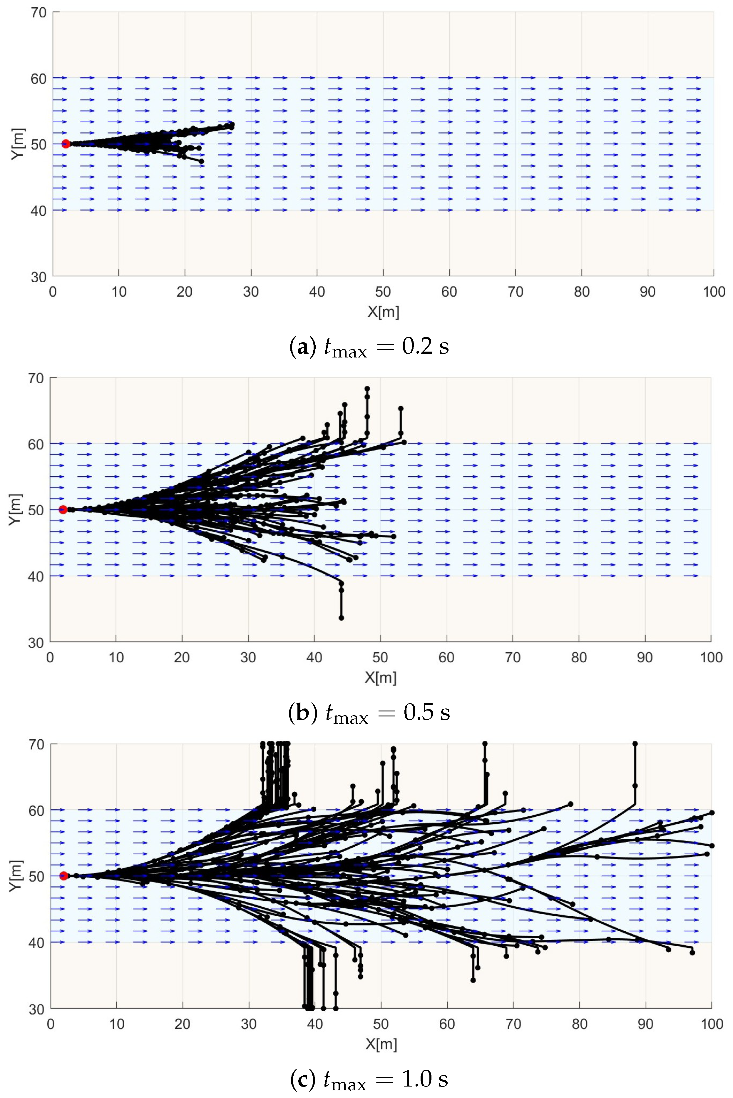 Figure 4 that, due to the vehicle’s underactuated nature, certain regions of the environment are unreachable, particularly those requiring lateral movement against the flow. This limitation is reflected in the absence of tree growth in those regions.
