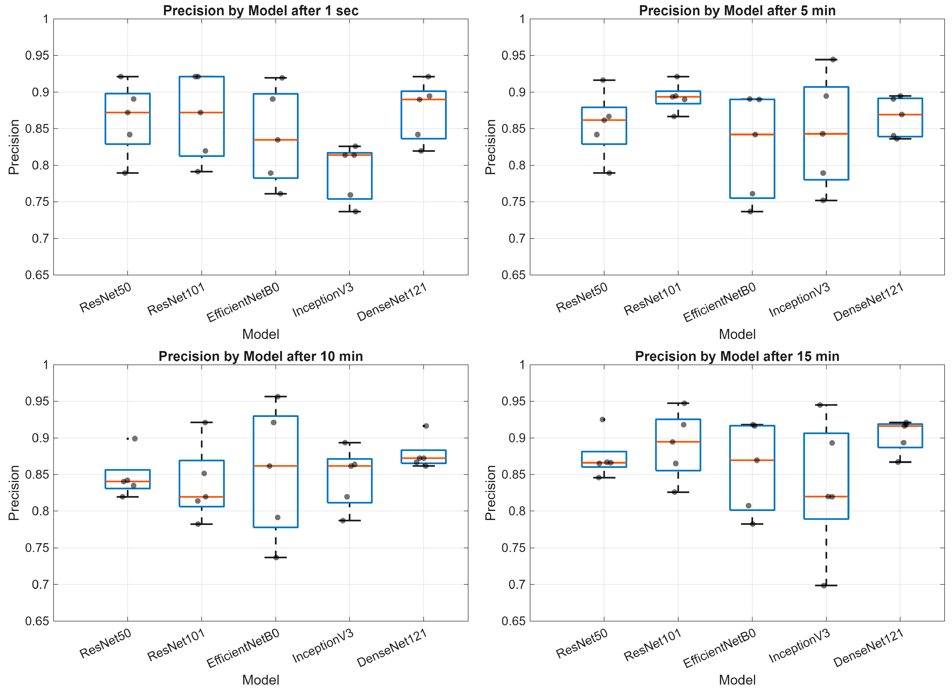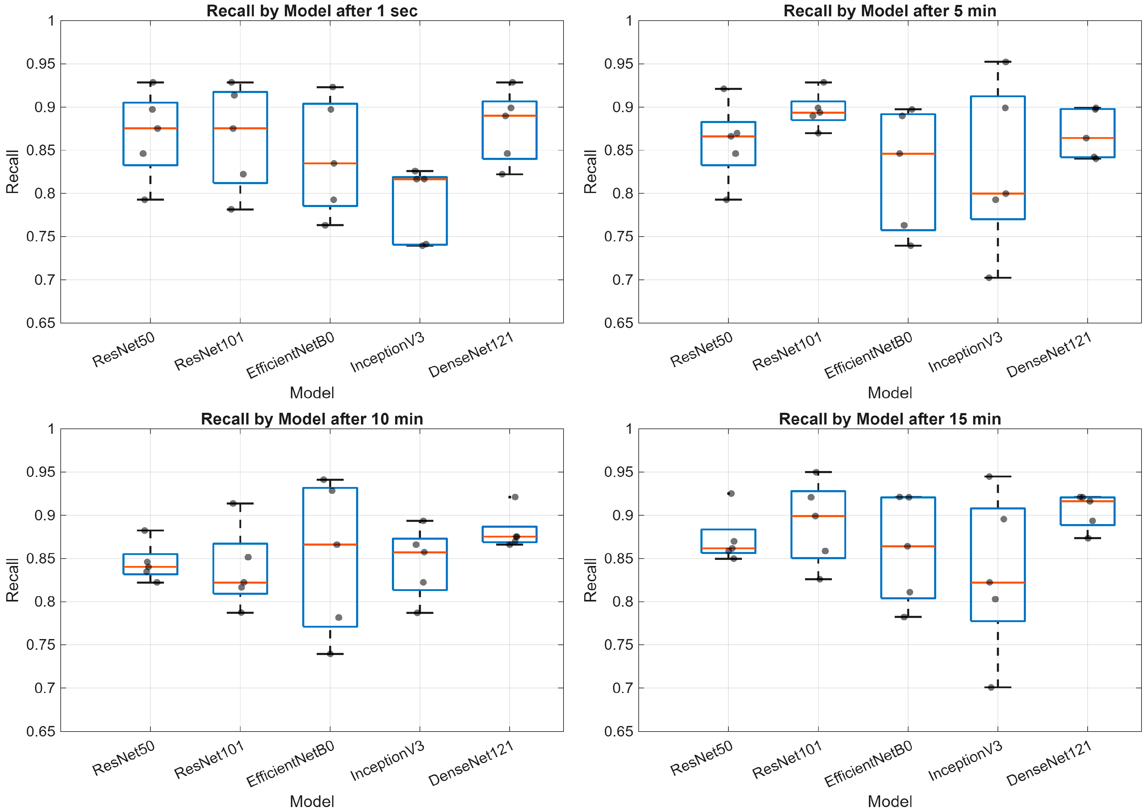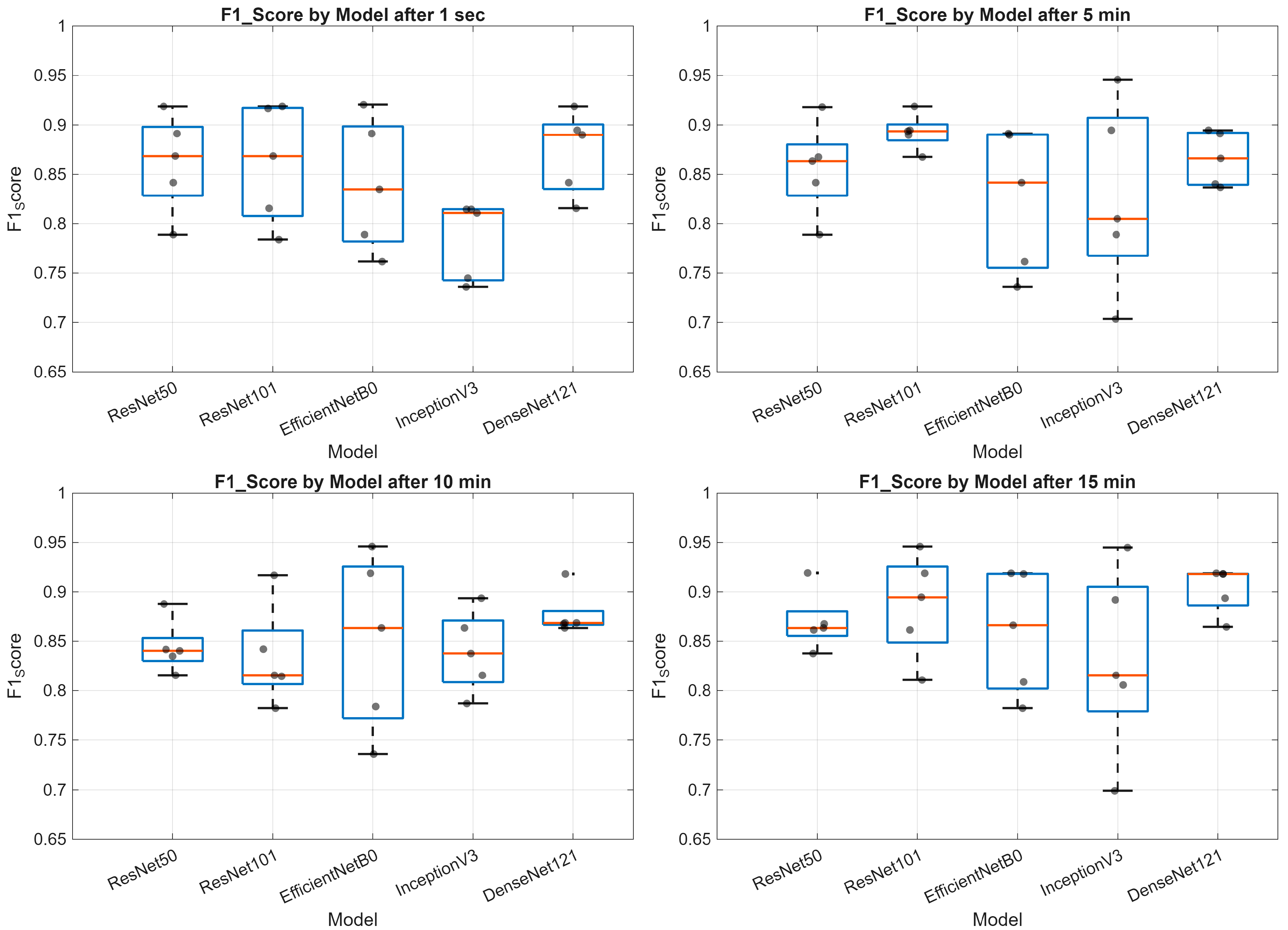 - ResNet101 demonstrated high performance in the early phases (up to 5 min) but was less stable in the middle measurement period, which may be important for applications requiring rapid diagnostics.