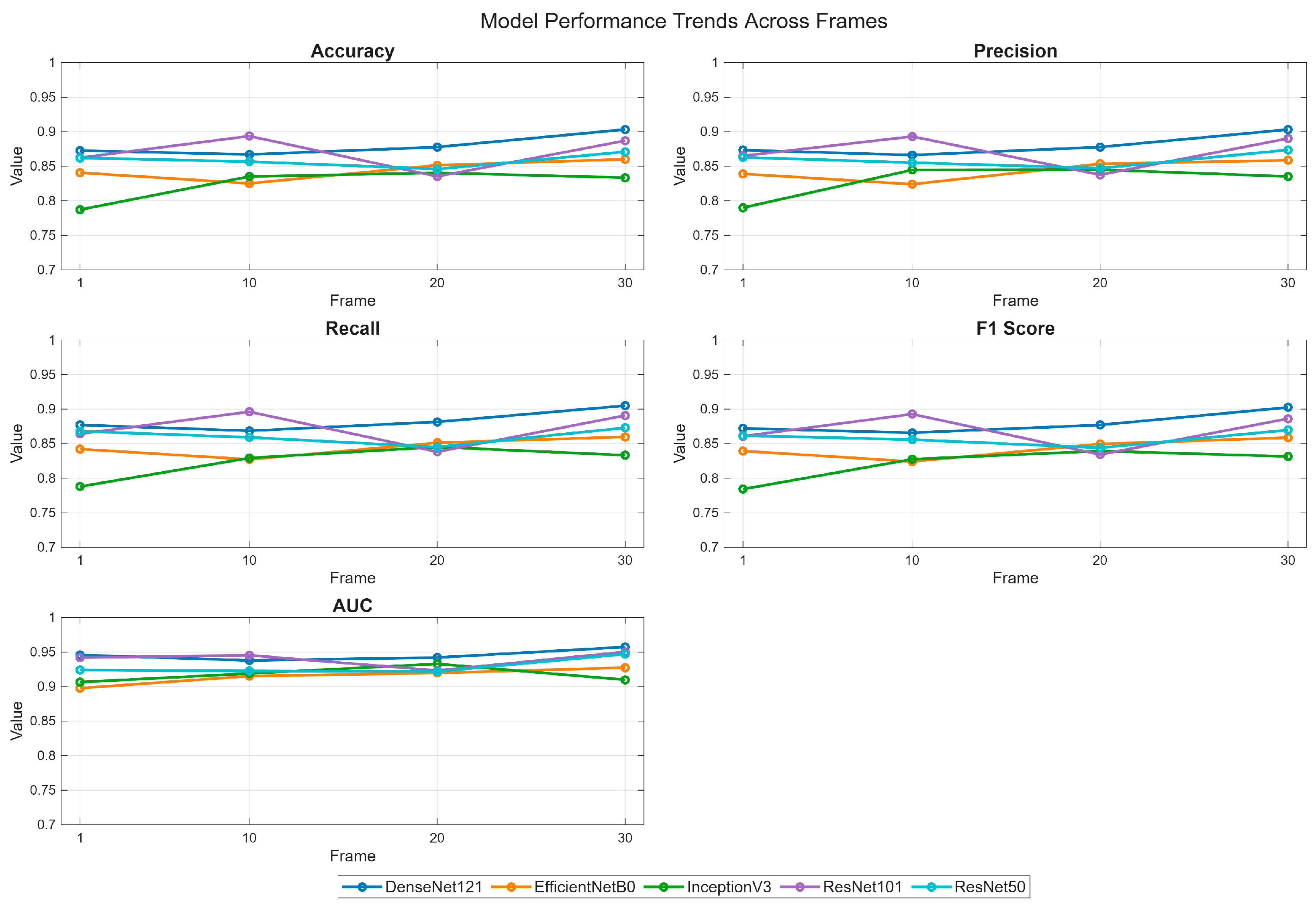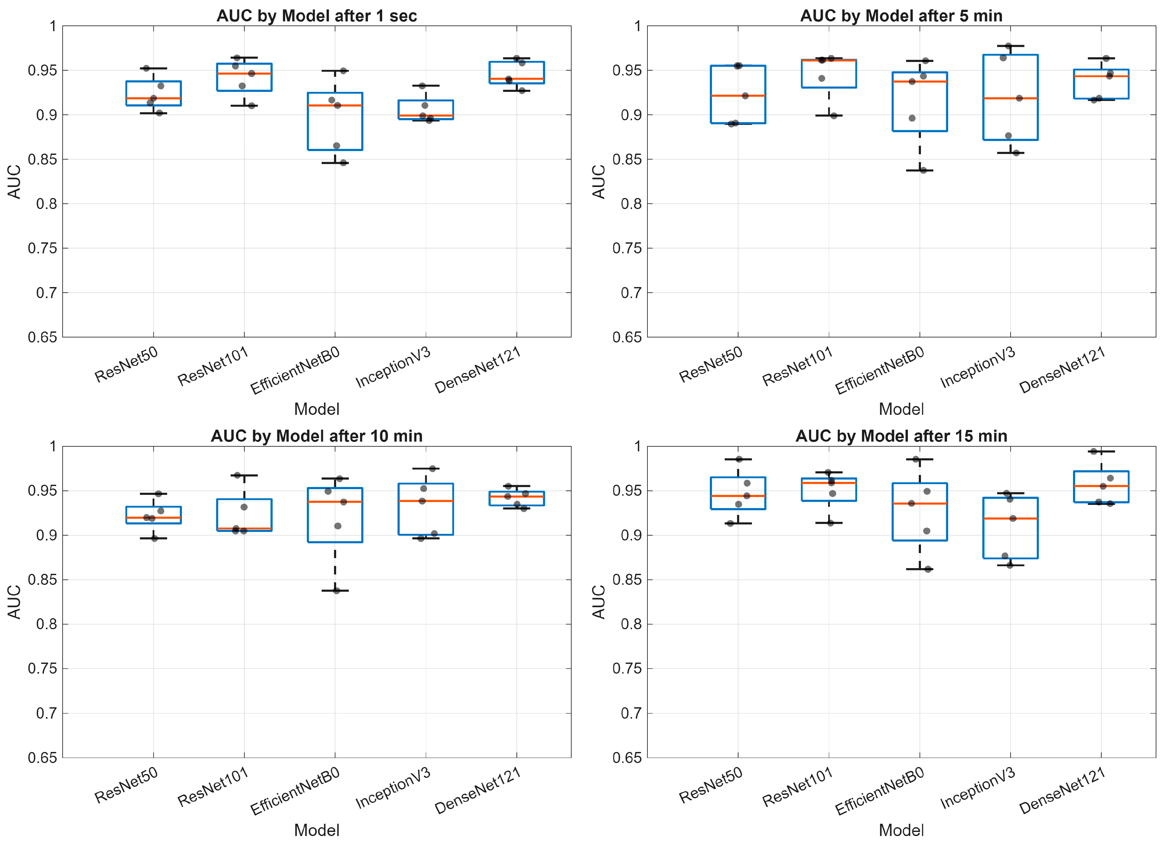 - DenseNet121 demonstrated progressive performance improvement, achieving the highest AUC values (up to 0.99) in the final phase of the study (15 min), suggesting its suitability for longer-term analyses.