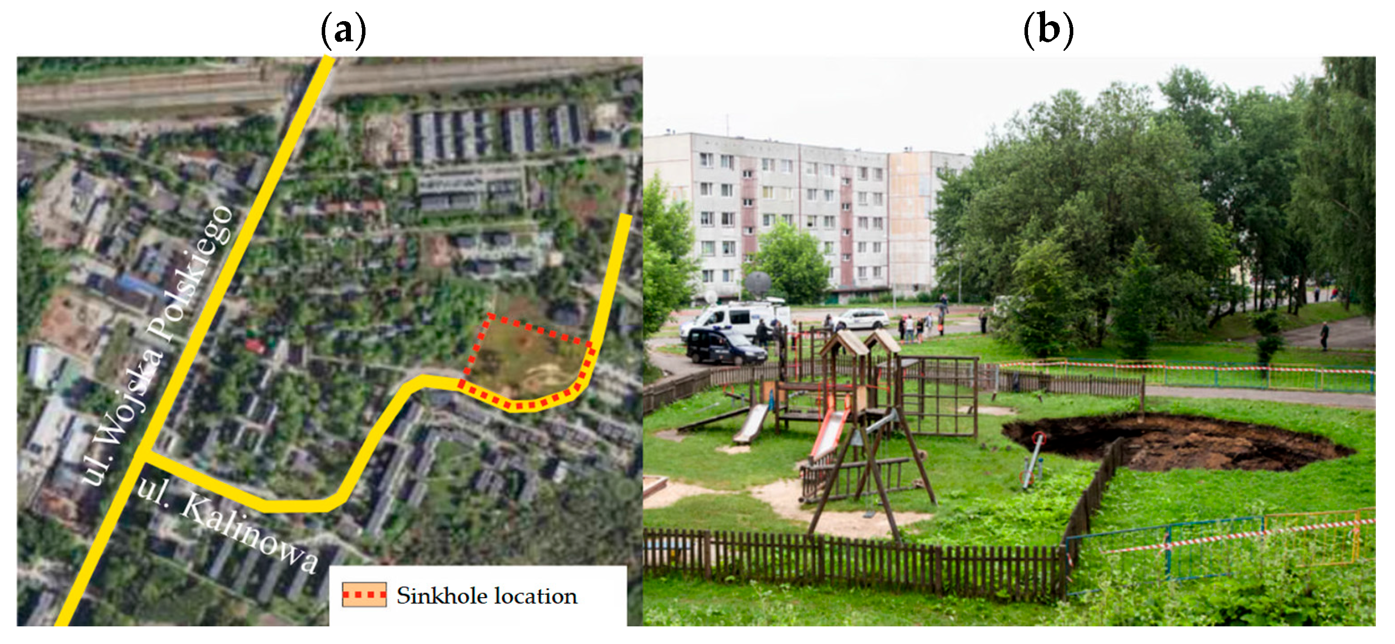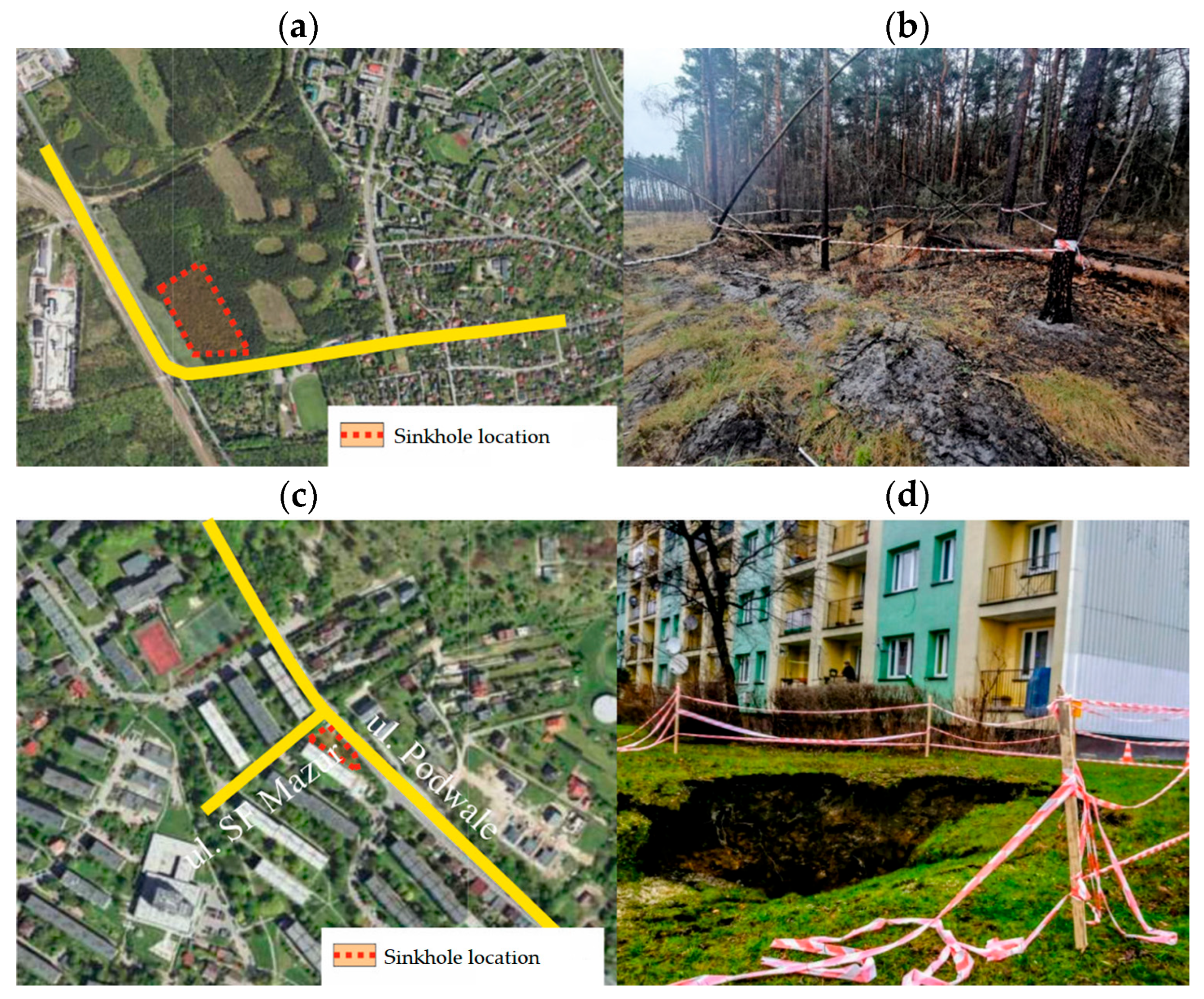 - Strzałkowski, P. Sinkhole formation hazard assessment. Environ. Earth Sci. 2019, 78, 9. [Google Scholar] [CrossRef]
