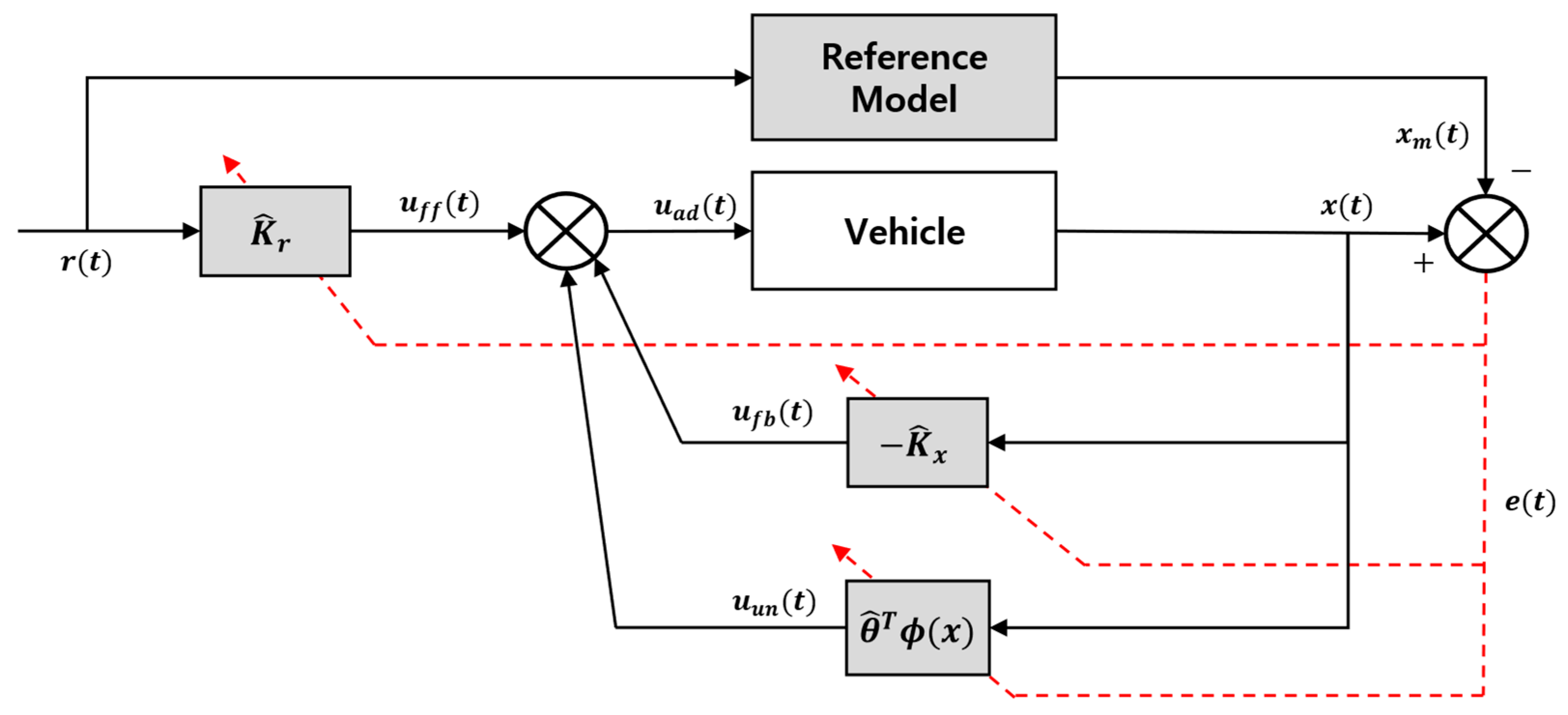 - Dixit, S.; Montanaro, U.; Dianati, M.; Oxtoby, D.; Mizutani, T.; Mouzakitis, A.; Fallah, S. Integral MRAC with bounded switching gain for vehicle lateral tracking. IEEE Trans. Control Syst. Technol. 2021, 29, 1711–1722. [Google Scholar] [CrossRef]