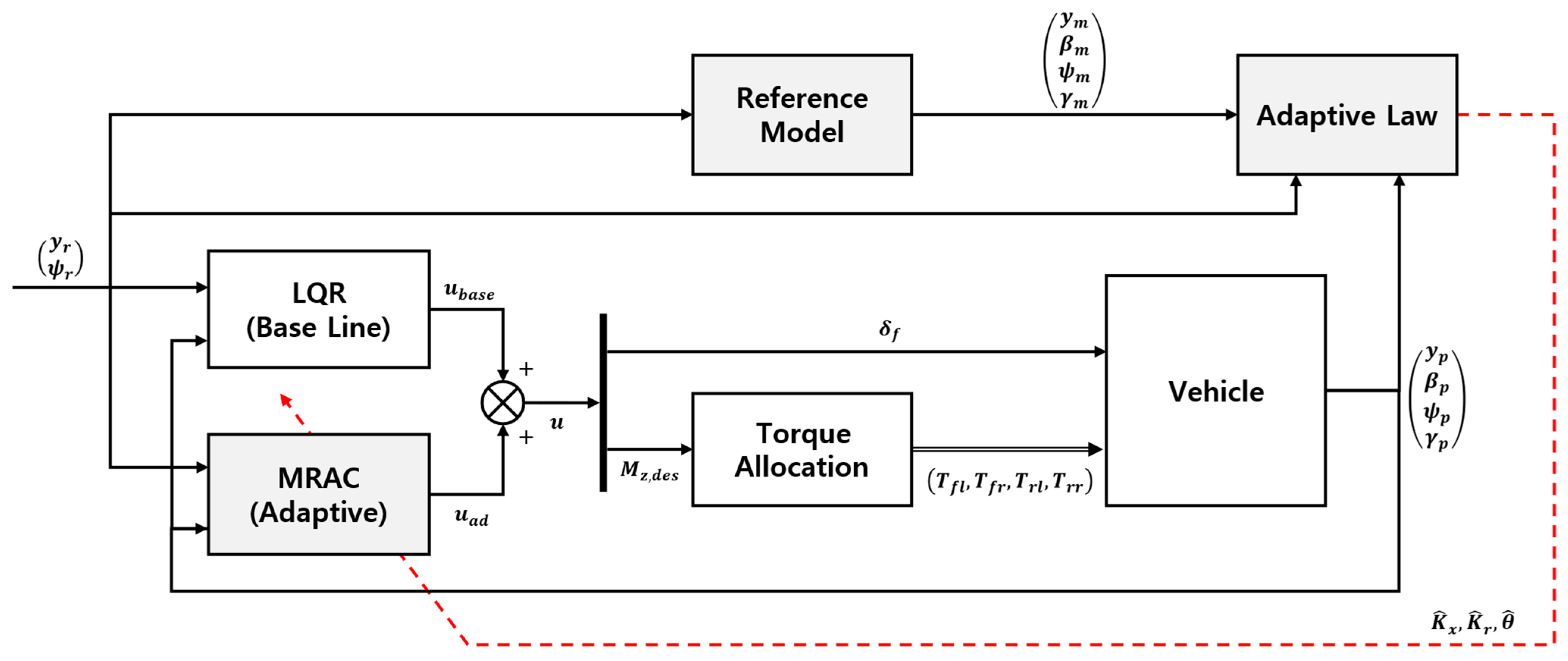 - Montanaro, U.; Chen, C.; Rizzo, A.; Sorniotti, A. Output-Based Enhanced Closed-Loop Model Reference Adaptive Control and Its Application to Direct Yaw Moment Control. Int. J. Robust Nonlinear Control 2024, 34, 9471–9500. [Google Scholar] [CrossRef]
