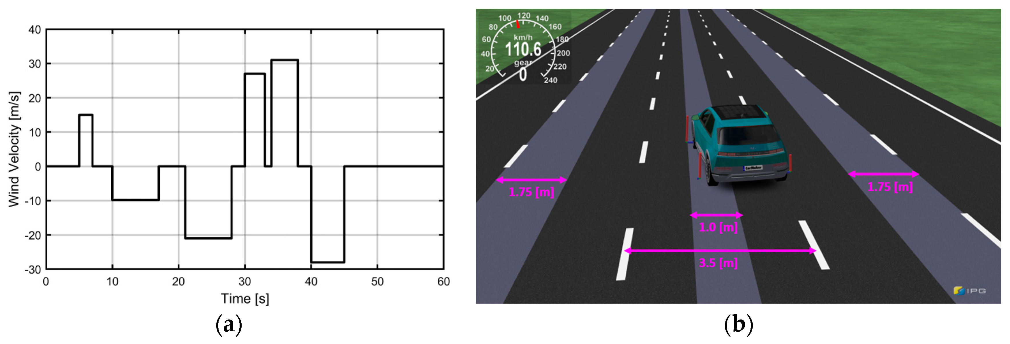 - Liu, H.; Liu, C.; Hao, L.; Zhang, D. Stability analysis of lane-keeping assistance system for trucks under crosswind conditions. Appl. Sci. 2023, 13, 9891. [Google Scholar] [CrossRef]